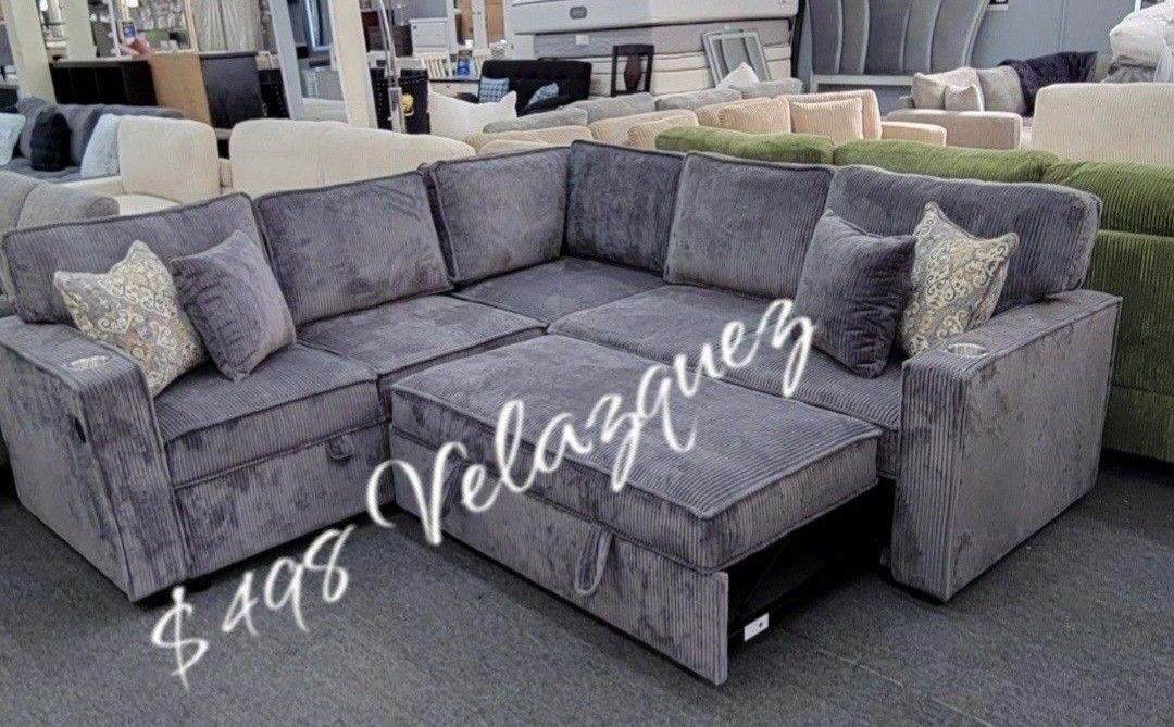 Transform your living space with this multifunctional L-shaped sectional that brings comfort, style, and practicality into one piece. This sleek design features a convenient pull-out bed, making it ideal for hosting overnight guests✅️Storage Sofa: 56" x 34" x 36" H; Corner Wedge: 34" x 34" x 36" H; Sleeper Sofa: 56" x 34" / 59" x 36" H Material Color: Dark Gray; Material: Corduroy✅️✅️$498+ sale tax $550 cash only this promotion is just pick up only Delivery is not available ✅️ ✅️ ✅️ LIMITED QUANTITY ✅️✅️