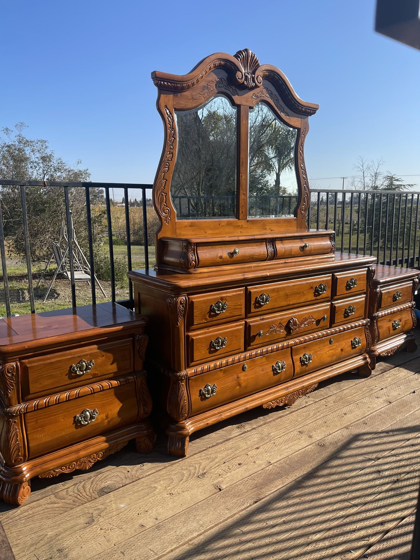 Includes Dresser 68” Long x 19” deep x 85” tall with mirror. Nightstands measure 28” wide x 17” deep. Headboard, footboard and 1 rail optional. Made by Magnolia Classics. Drawers open smooth. Not perfect but priced accordingly.
