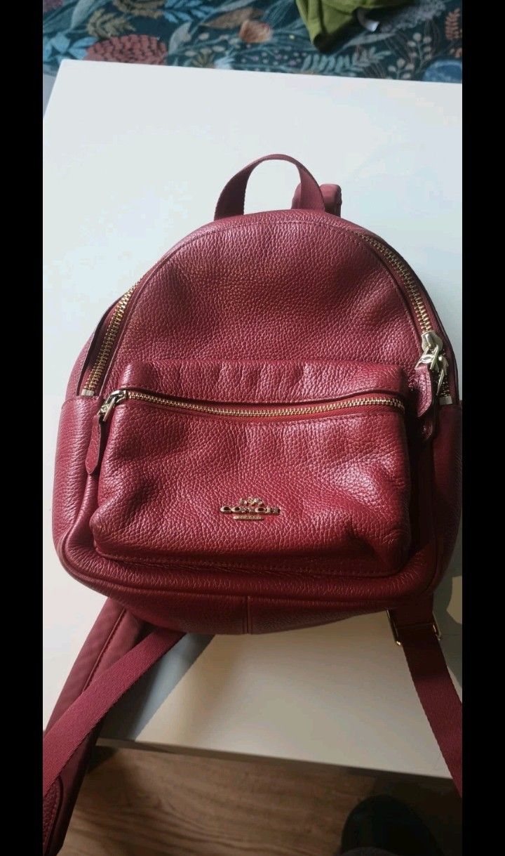 Condition: Like New Authentic Coach backpack made from red pebbled leather with the classic Coach logo on the front. Features a smooth zip closure, a roomy main compartment, and multiple inner pockets to keep things organized. Also includes an outer zip pocket for easy access to essentials. The pebbled leather has a nice texture and holds its shape well.