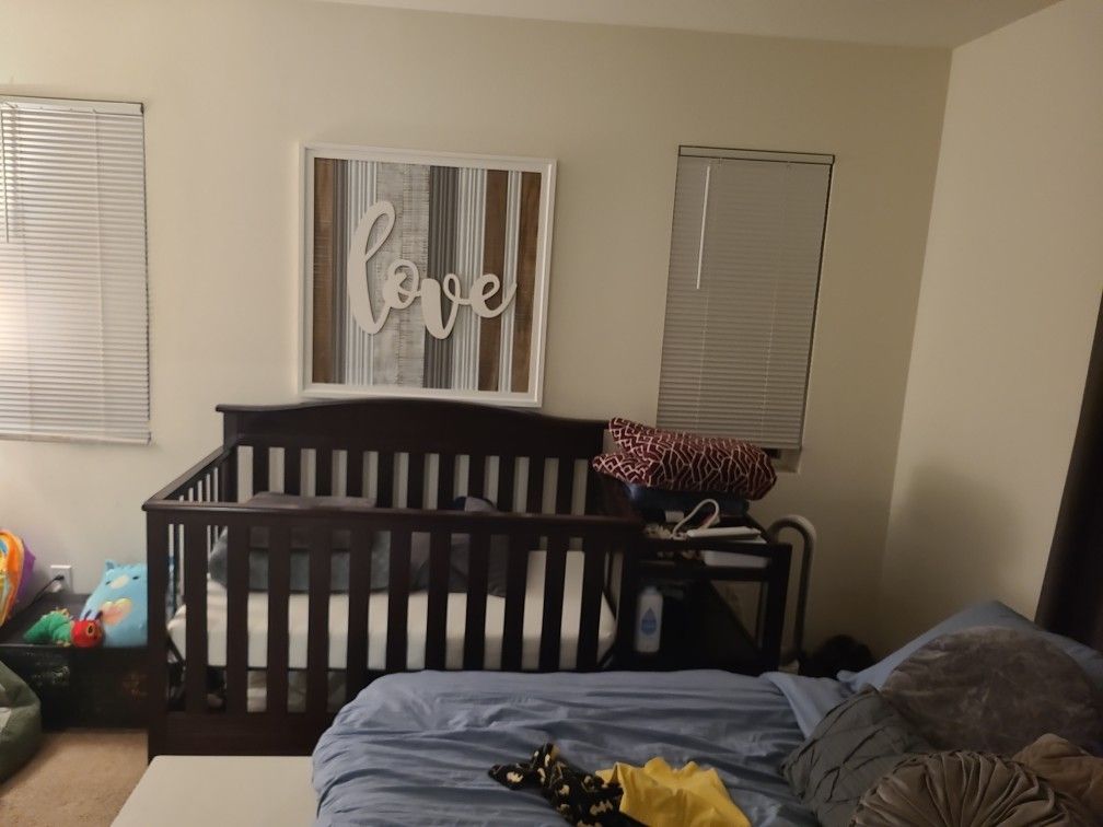 Dark cherry wood crib with 2 drawers, 2 shelves. Barely used but I am keeping mattress.