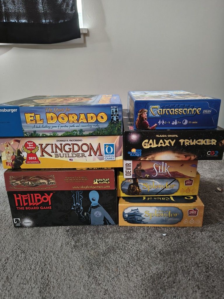 Selling 8 boardgames + one expansion for prices ranging between $20 - $80 each. All of them except for Galaxy Trucker have incredibly minimal use and have mostly sat on shelves for years. Prices are as follows: Galaxy Trucker - $20 El Dorado - $25 Carcassonne - $30 Silk - $30 Red Dragon Inn - $30 Kingdom Builder - $45 Splendor + Expansion - $70 for set ($40 and $35 individually) Hellboy - $80 Prices are negotiable but don't try to low ball too hard.