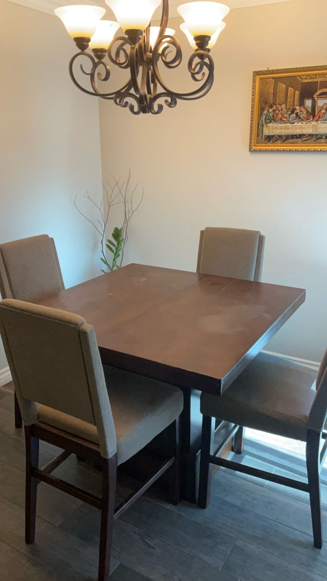 Bar high table with 6 chairs and expandable extension leaf to 60 inches No leaf 42x42