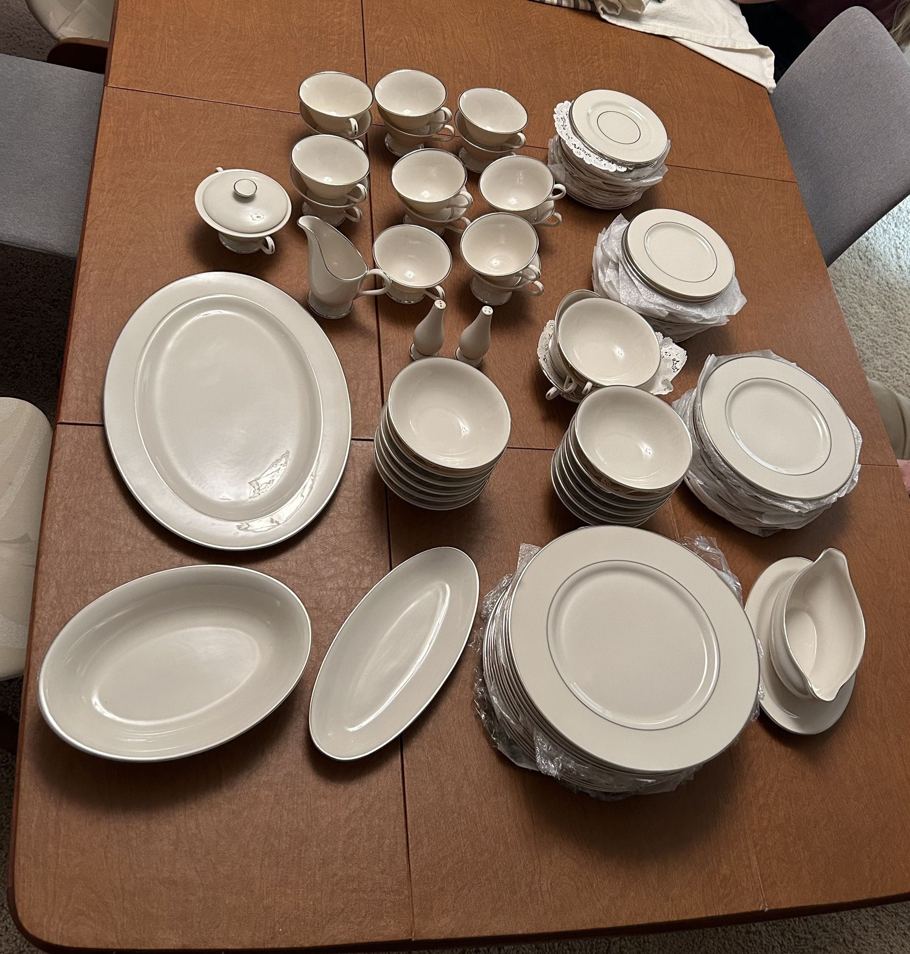 Fine Bone China set. Fine Arts Fine China Classic Dignity Platinum set with 92 pieces. (Mid Century Modern style) Gravy Boat, big platter, serving dishes, 12 plates, 12 bowls, 12 salad, 3 bowls with handles, sugar bowl (with lid), creamer, 15 coffee cups, 15 saucers plates, 15 dessert plates, salt and pepper