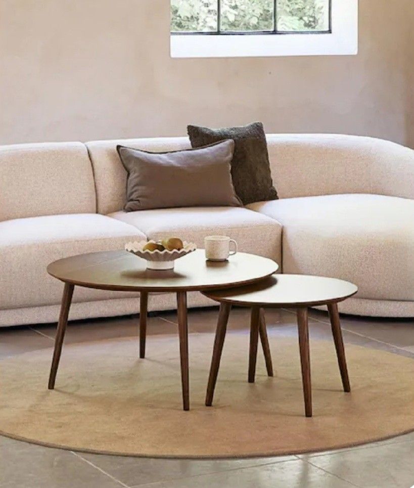 This is new - as you would get from Home Depot - unassembled in original box. Nice piece. About This Product: Effortlessly blending into any living space, this set of 2-nesting circular tables offer a seamless combination of form and function. Available in Smoked Oak woodgrain finishe, enjoy the timeless beauty of oak wood. This set includes 1-large table and a smaller nestable table. This dynamic duo allows for versatile arrangement, catering to your individual style and spatial preferences. Oak wood finishe: smoked oak Sturdy solid oak wood legs Includes 2-circular tables: (1) 34.65 in. wide and 17.75 in. high, the other 23 in. wide and 16.125 in. high Soft rounded edges offer a more organic appeal to a modern design Use as a set of nested tables or as 2-individual tables around your space Minimal assembly, just attach legs