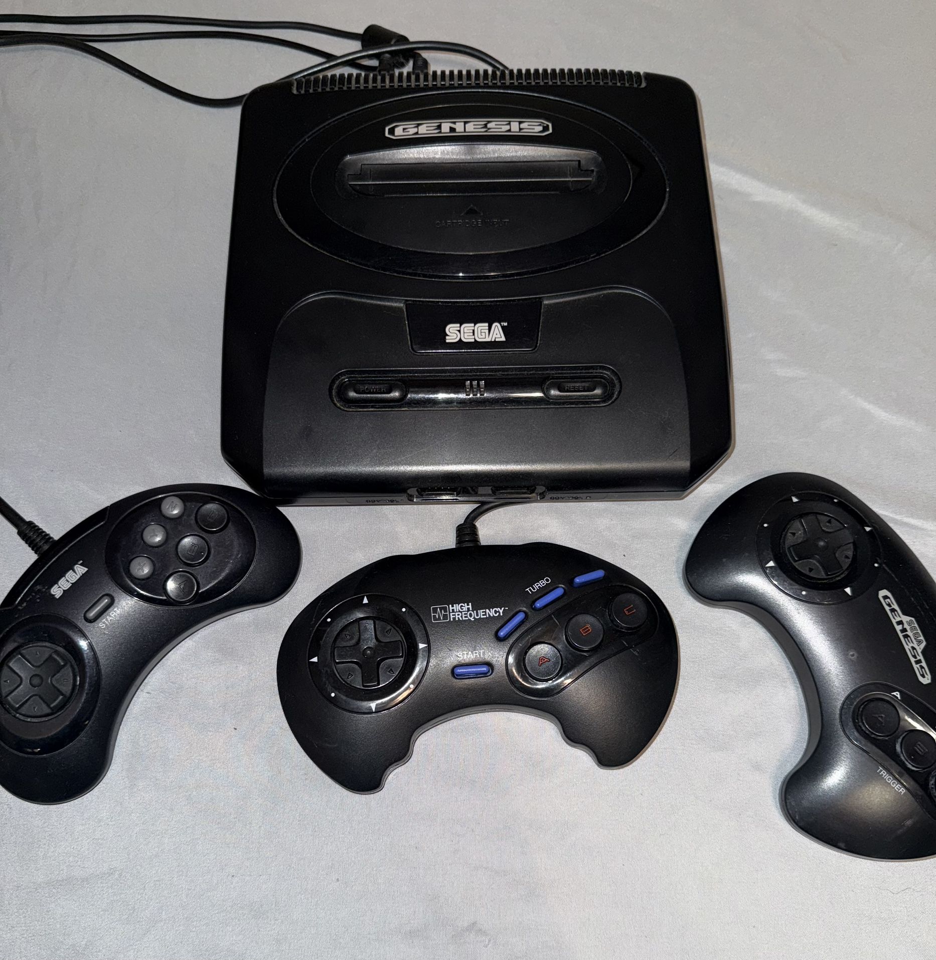 Adult Owned Sega Genesis 2 Bundle with cords, 3 controllers , & 26 games total . WF Royal Rumble X-men (x2 copies) Andretti Racing Star Trek The Next Gen FIFA International Soccer TMNT Turtles Tournament Fighters Lion Ling Target Earth 688 Attack Predator 2 Sonic 3 ( could not get cartridge to play ) Sonic 2 Toy Story NBA Jam Tournament Final Zone ESPN Baseball Tournament Animaniacs Tecmo Super Bowl Urban Strike Road Rash Bulls Vs Lakers NBA Playoffs Bulls Vs Blazers NBA Playoffs Desert Strike NBA Live 25 (No Label) 6 Game Bundle Cartridge (Streets of rage , Sonic 1, Golden Axe, Revenge of Shinobi, Columns, Super Hang On.)
