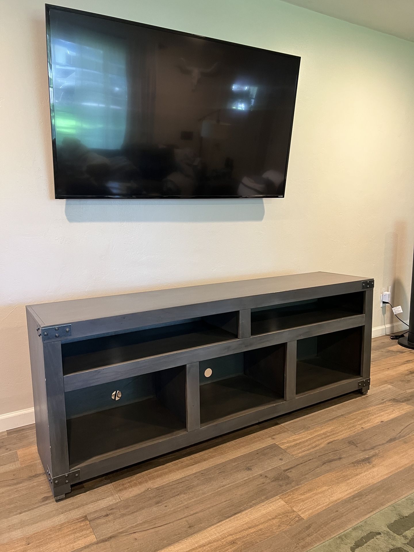 Gray wood media console with a clean, modern look. Measures 71.5” wide x 16.5” deep, making it a great fit for larger TVs or as a storage piece. Features 5 open cubbies plus 4 included wicket baskets (not pictured) for easy, organized storage - perfect for media accessories, books or decor. In good, sturdy condition. There is a scratch on the top and some minor chipping on the side, reflected in the price. Fully functional and solid overall. Pickup only.