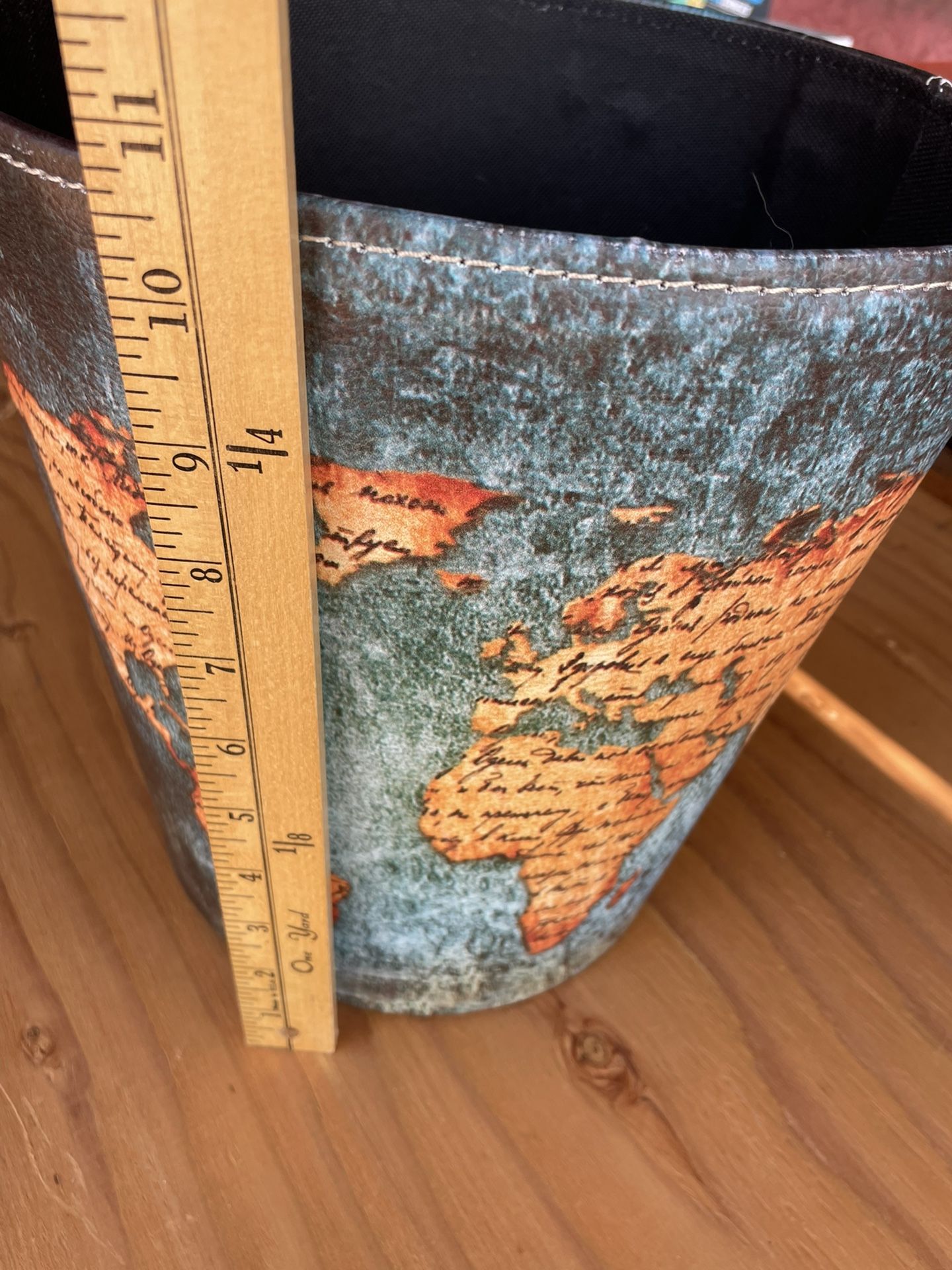 Believe it’s vinyl not leather. Vintage printed with world map. Never used. 11” h 10” diameter