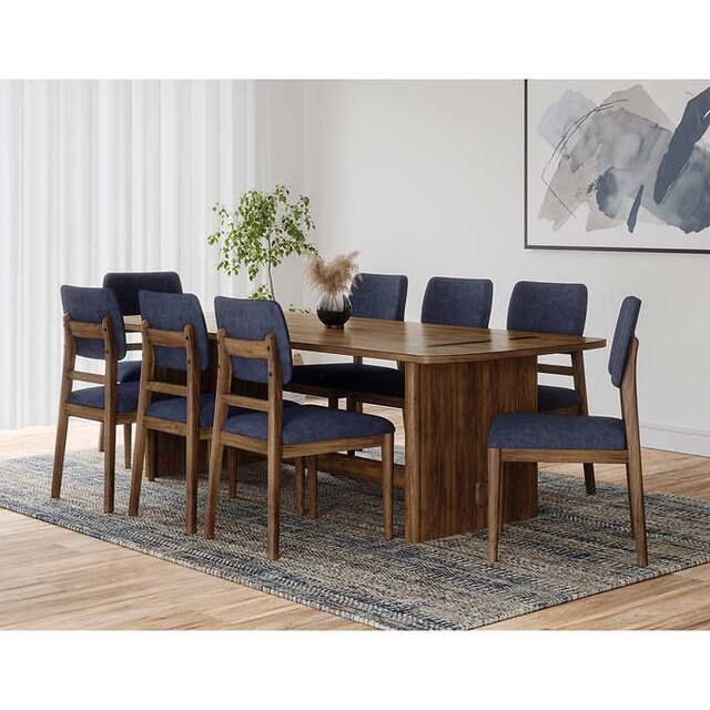 Isabel 9-Piece Dining Set, in good condition (display item) Minor blemishes. Send me a message if you’d like to come see it Includes: 1 Table and 8 Chairs Features: Mahogany solids and walnut veneers Brown Finish Stain resistant Fabric Decorative veneer inlays Adjustable levelers Fixed table top Fits up to 8 chairs Dimensions: Table: 94" L x 42" W x 30" H; Weight: 171.52 lbs Chair: 21" L x 22.7" W x 36.3" H; Weight: 18.47 lbs Additional Dimensions: Seat height: 19" Seat width: 21" 45286