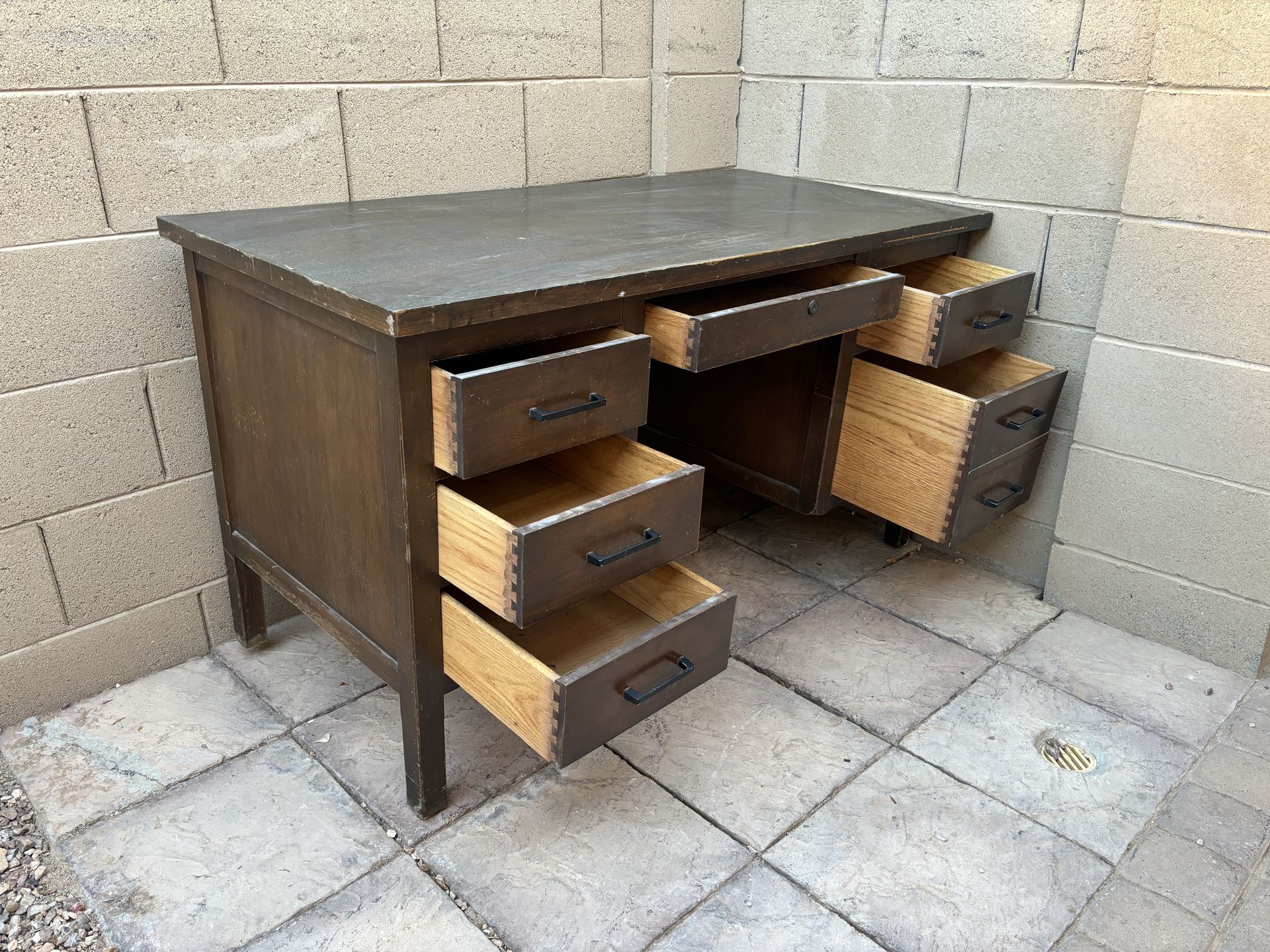 Large solid wood executive desk with plenty of drawer storage. Very sturdy and well built. Great for a home office, business, or workshop setup. Features: • Solid wood construction • Multiple drawers for storage • Wide work surface • Very sturdy and heavy desk Condition is good overall with normal cosmetic wear on the top as shown in photos. This is a large executive-style desk, not a lightweight particle board desk like most new ones. Asking $100 OBO Delivery Available 🚚