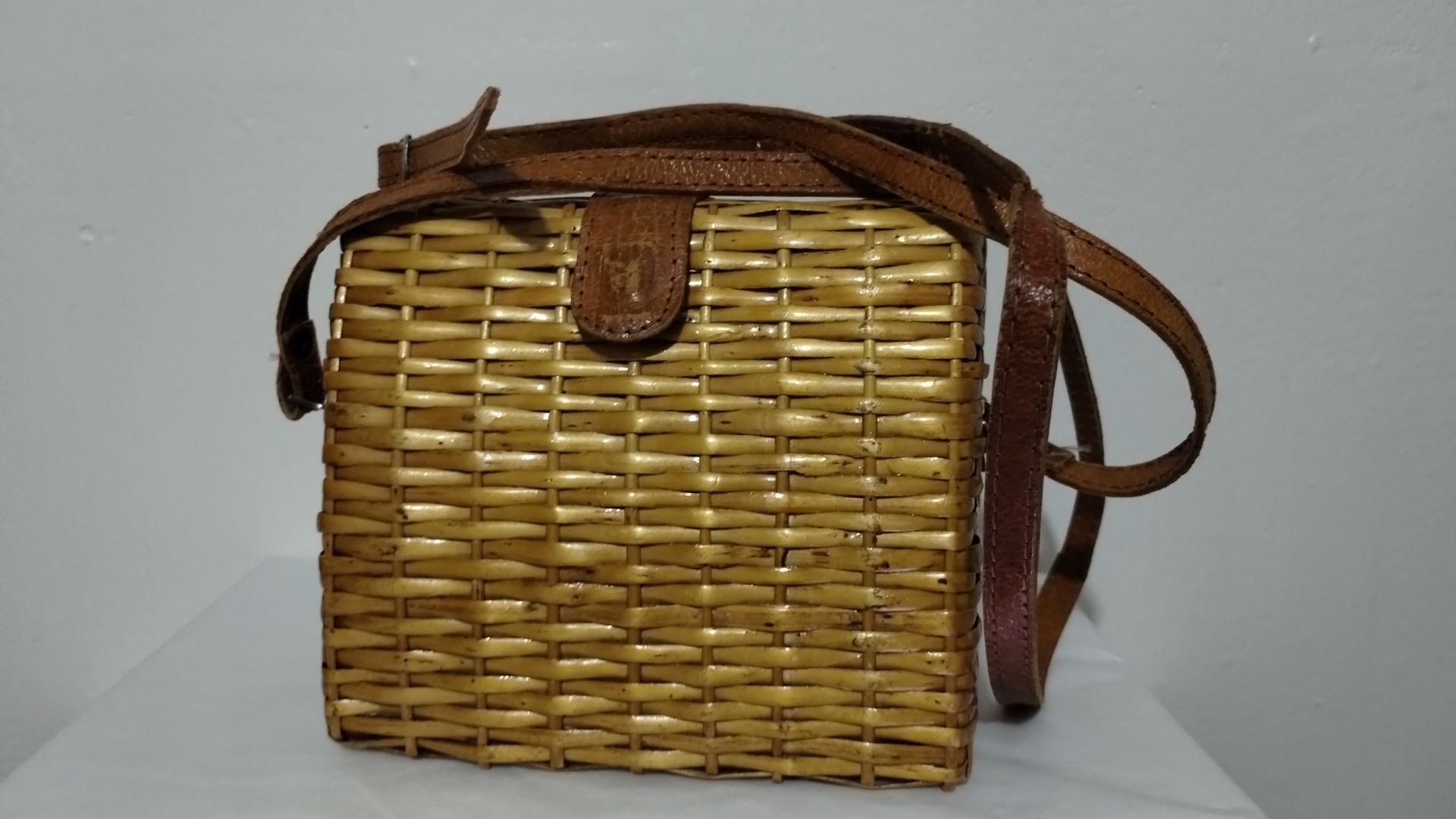 VINTAGE RATTAN - STRAW / NICKEL AND LEATHER BAG. 6"×3.8"×5.5"H / HANDLE 23" GREAT CONDITION