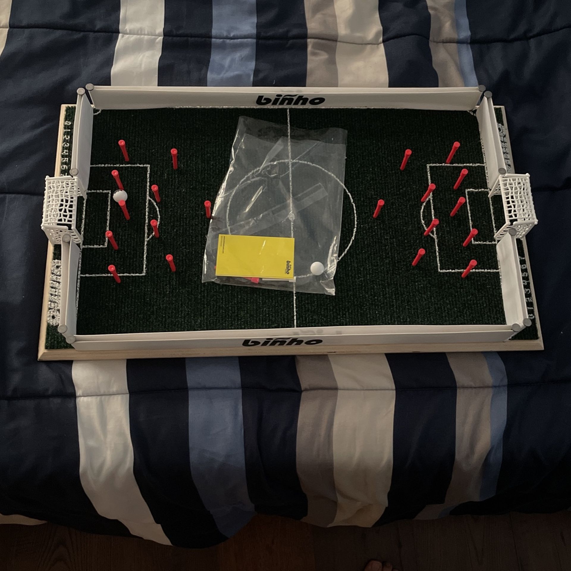 Biñho board flick soccer game comes in perfect condition and has been used once. Come with 2 balls and 2 extra pins. Yellow card and red card provided. Please reach out if any questions!!