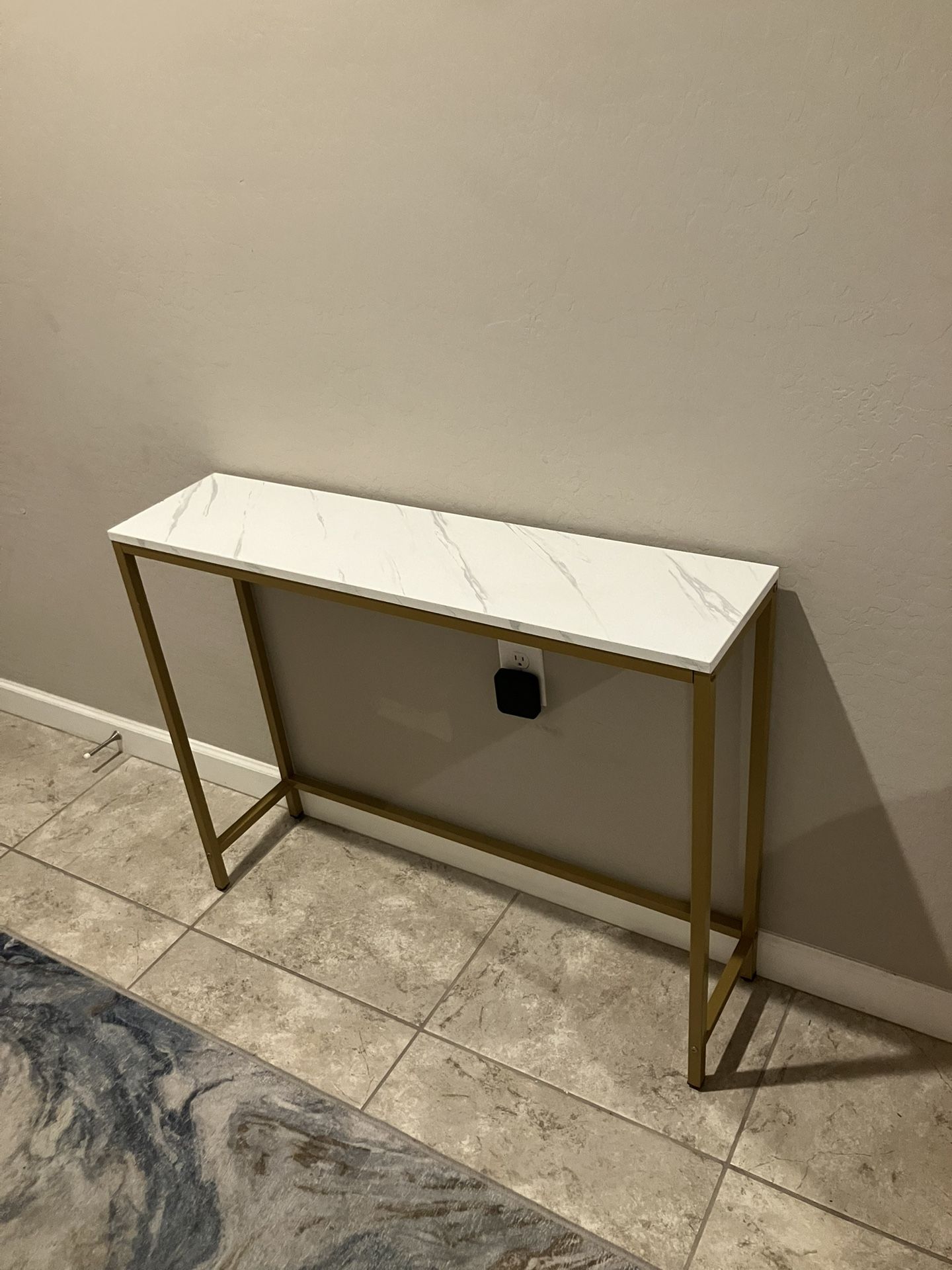 Gold and faux marble slim entry or console table Perfect for small spaces or entry areas Has a burn mark on one of the sides of the table seen in the photos from an incense. Can be decorated very cute see photos for all details. Measurements: 38 inches long, 9.5 inches wide or depth and 29.5 inches tall (2.5ft tall) Can deliver for a fee or pickup in Laveen thanks !
