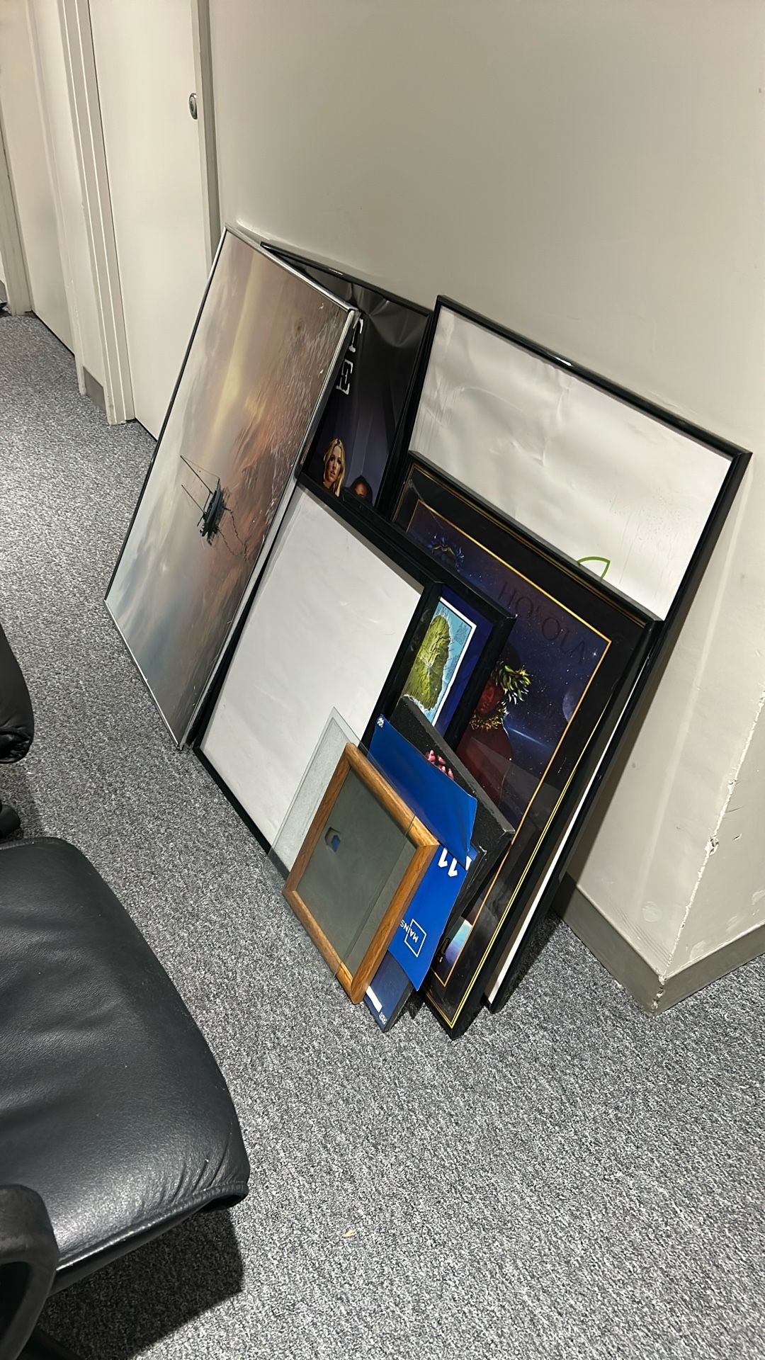 Office furniture, four leather chairs one of them has some significant more in the arms, but overall very good condition including office pictures. There’s a period of them. Also I have a very long 6 foot long cafeteria size foldable desk, including a foldable, laundry hamper, one large corkboard, a small corkboard, and the pictures you see in there as well, but you have to buy all the leather chairs and you get the rest for free. Again, if you buy all those other chairs, I’ll throw in the pictures and the cork boards even the long desk table, including the hamper that is very convenient and folds up and folds down. If you buy all the chairs grand total $70 you get basically everything this is dirt cheap don’t be the last person to buy it.