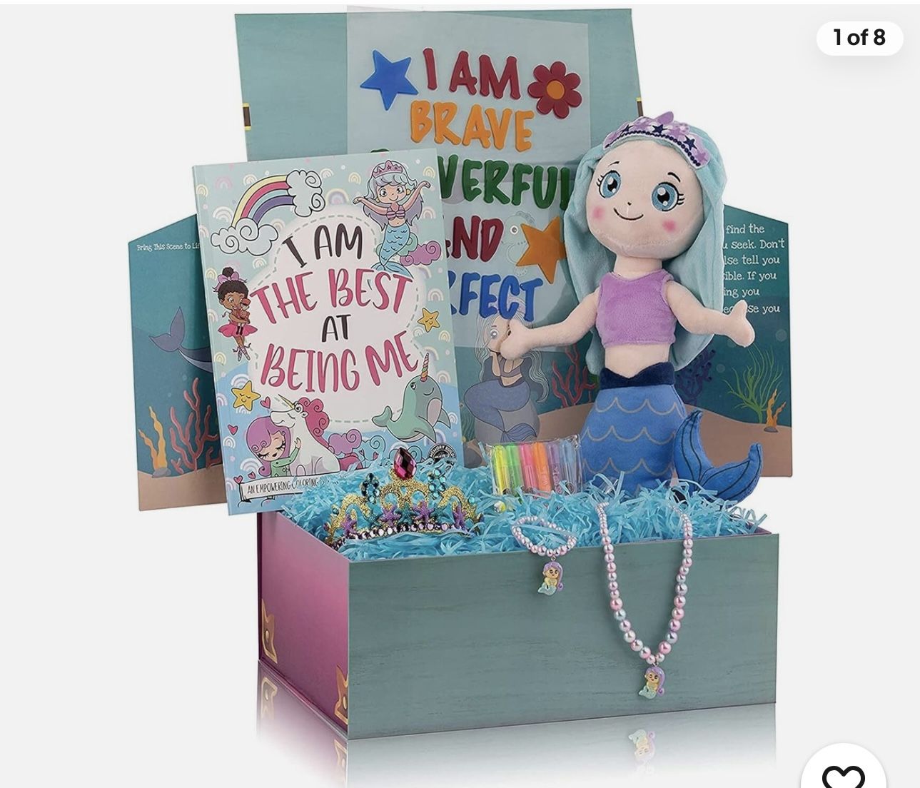 is a 6-in-1 gift set that includes a mermaid plush, a coloring book, window clings, pens, a necklace, and a crown headband. The plush mermaid is approximately 17" long and has soft blue hair and sparkly eyes. The set is designed to be an empowering gift for children. It comes packaged in a durable, decorative box.