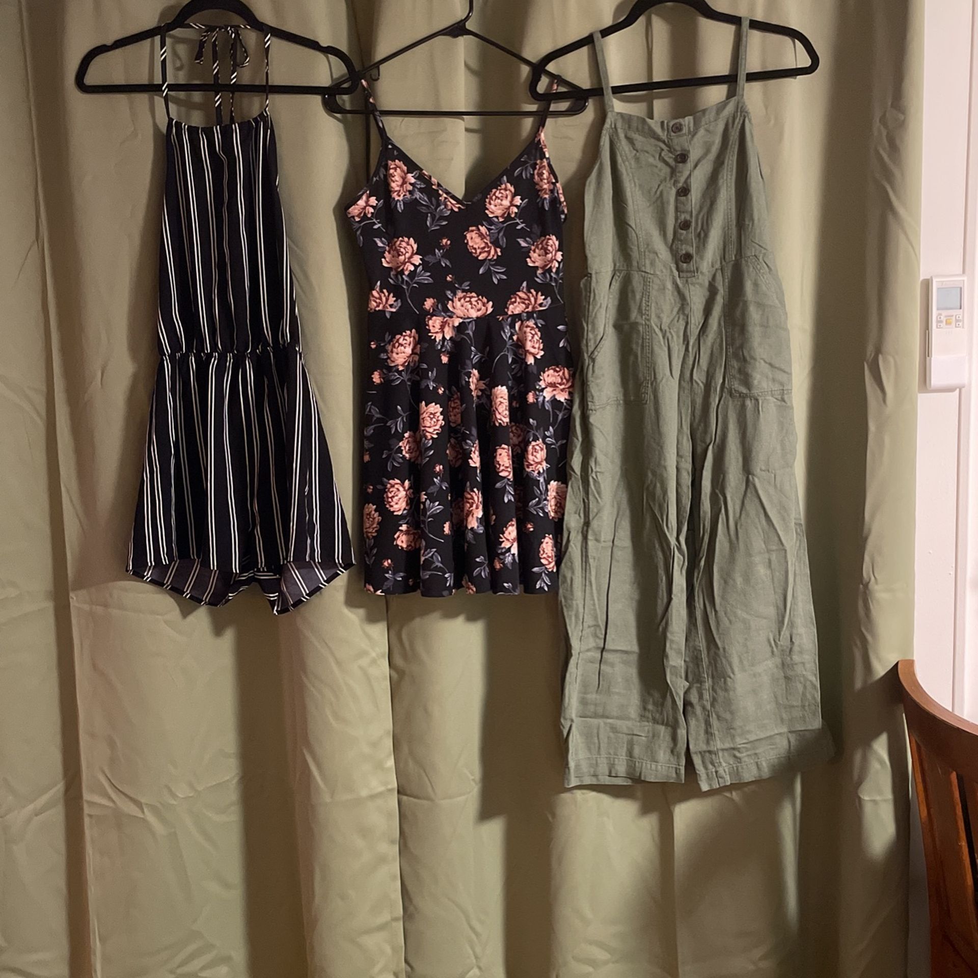 $6 each! Black and white pinstriped backless romper Floral dress Green jumpsuit with pockets