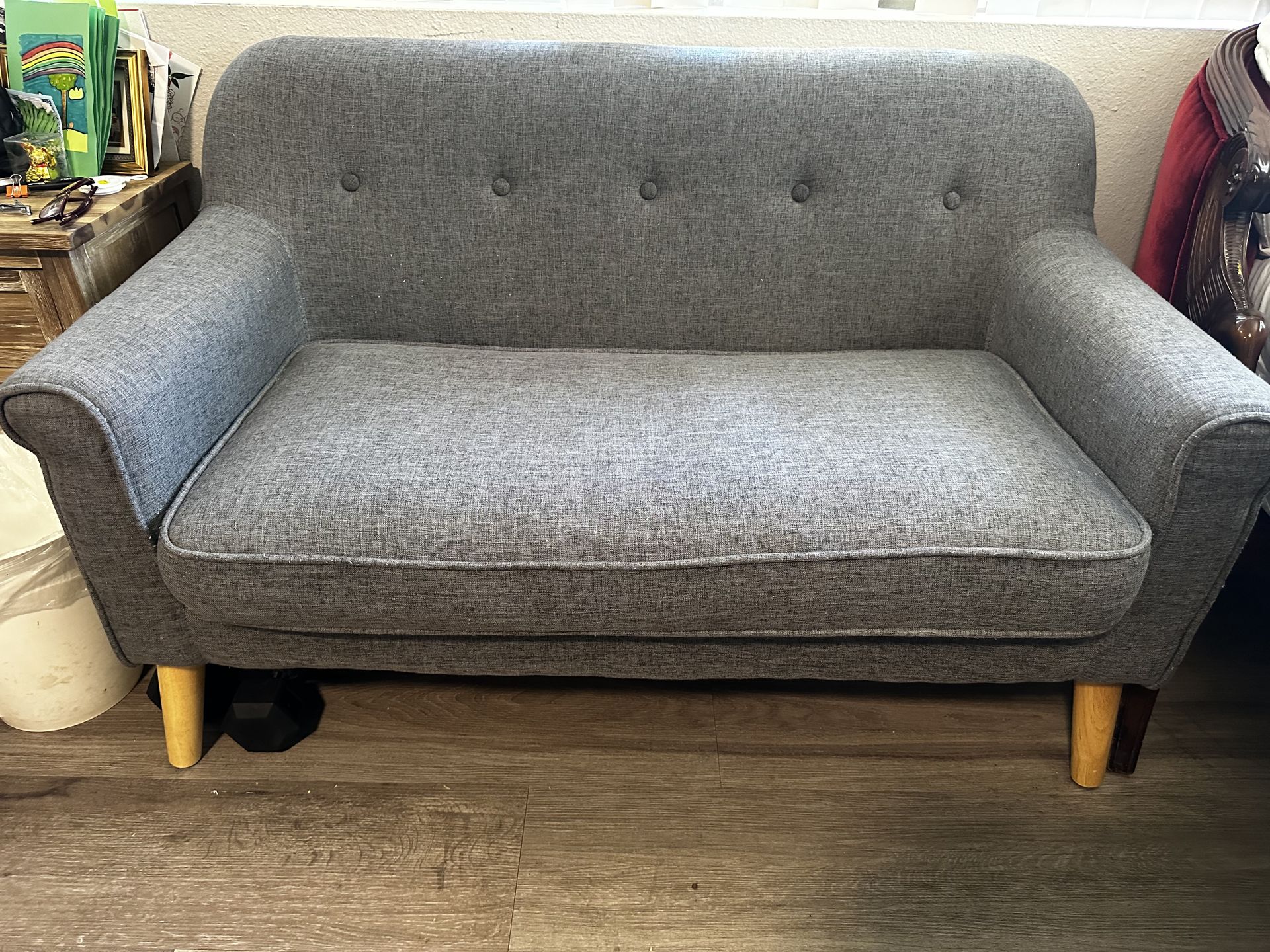 Modern gray loveseat with clean mid-century design and wood legs. Comfortable and compact — perfect for apartments, offices, or small spaces. Good condition with minor wear from normal use. Pickup only. 50in L 32in H 28in Deep