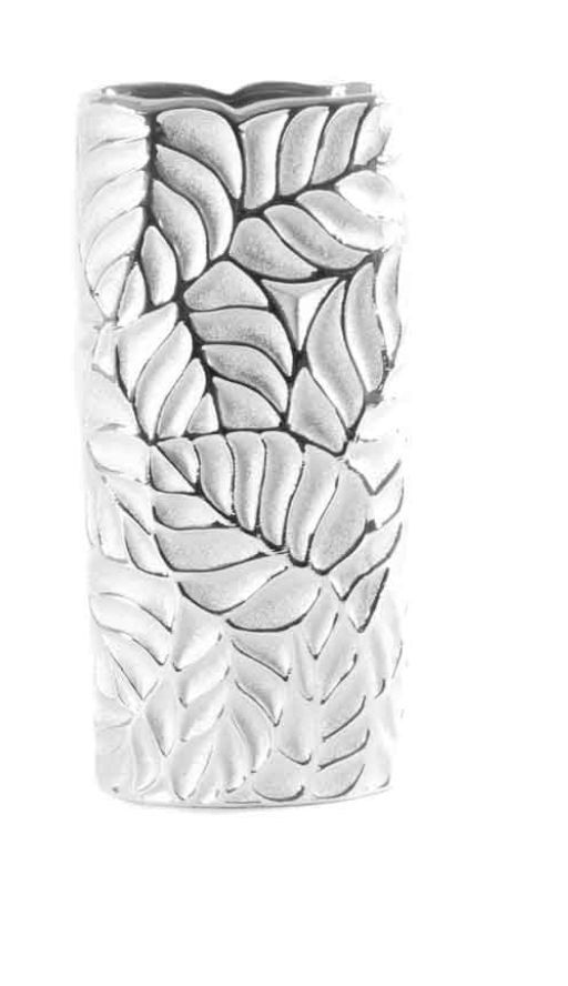 This striking ceramic vase features a cylinder look with a leaf design and crackle effect. This beautiful modern vase can be used to hold flowers or used alone as a statement piece in any corner or console table. Finished with the highest quality ceramic material and finished with a silver gloss. Size: 16.5"H X 3.5"D X 7"W Material: Ceramic