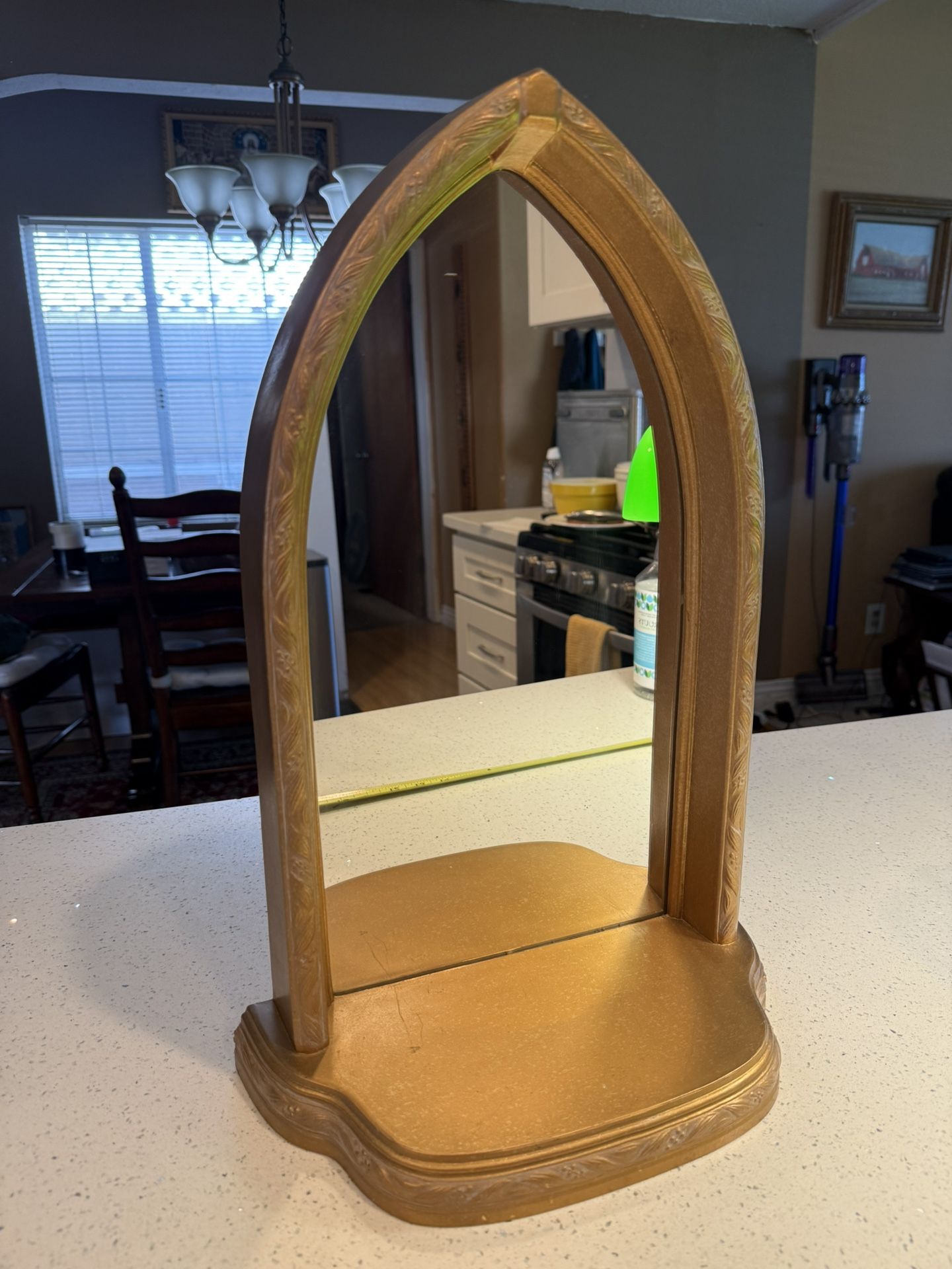 Elegant vintage Home Interiors gold arched mirror that works both as a tabletop vanity mirror OR wall-hanging mirror. Classic cathedral arch design with decorative detailing — perfect for adding vintage charm to any space. Details: • Brand: Home Interiors • Model: #17027 CV • Era: Vintage (1970s–1980s) • Material: Molded resin frame with glass mirror • Color: Gold • Can be freestanding or hung on the wall (hardware on back) Approx. Size: • Height: ~16 inches • Width: ~9 inches • Depth (base): ~5 inches Condition: • Good vintage condition • Light surface wear from age • Mirror glass is intact with no cracks • Displays beautifully both ways (see photos) Perfect for vanity use, bathroom décor, bedroom, entryway, Hollywood Regency, cottagecore, or vintage glam interiors.
