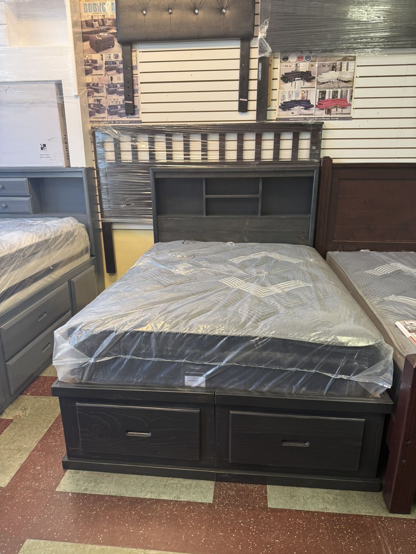 Full dark grey/black bed frame and mattress Color is optional and you can choose between the colors showcased on the piece of wood. We deliver and make any type of beds you’d like. Delivering cities include LA, IE, South Bay, SGV, and surrounding cities.