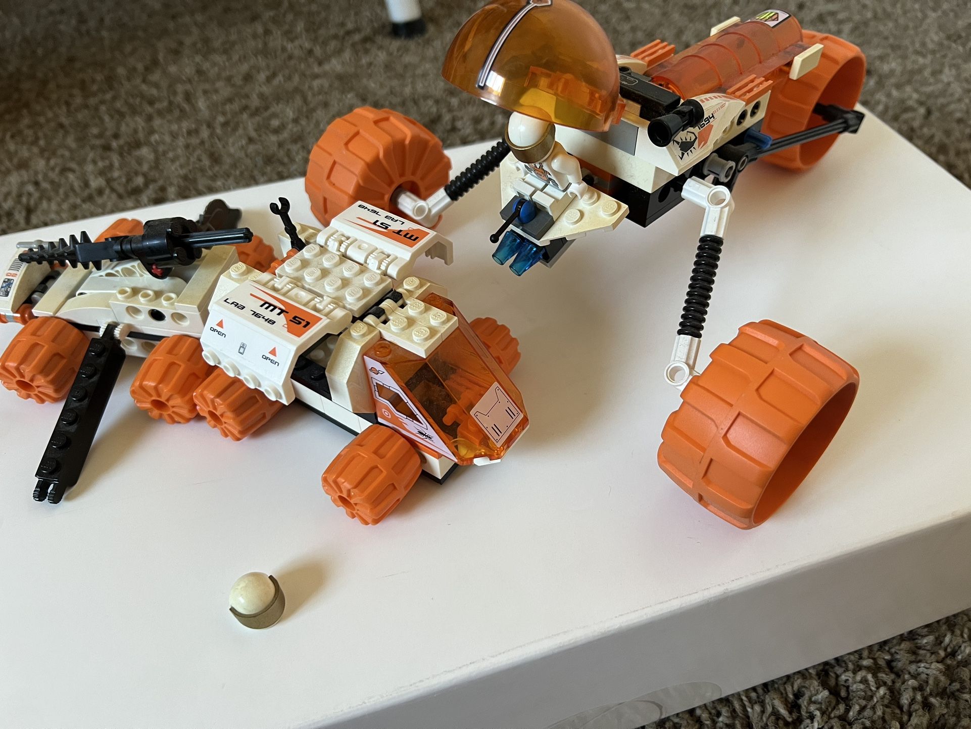 Misprint Pieces: LEGO MT-31Trike (7694) & Mining Unit 7648 The Mobile Mining Unit (set no. 7648), curiously, has a sticker that says, “MT-51” which would actually be set no. 7697 (which this is not). The sticker should say, “MT-21.” It seems to be a factory misprint of the stickers. Vehicles only - no manuals or boxes. Pieces may be a little dusty from being displayed (versus played with) Missing: One Astronaut, two alien figures, radar and missile (on top of Mining Unit), gems and round discs at the ends of the stabilizers. Some of the white bricks have yellowed with time which is normal for white pieces. Overall, the MT-31 Trike looks about 99% complete and the Mobile Mining Unit about 90% complete. Retired. Released: 2007 Themes: Mission to Mars, Space, Also listed separately: Star Wars sets 4483, 6206, 7669, 7671, 7676, 7681 I can meet in downtown San Diego, in Chula Vista (Rancho del Rey area next to Bonita Vista Middle School) or you can suggest a different location. Ask me any questions. No trades and cash only. Hablo español.