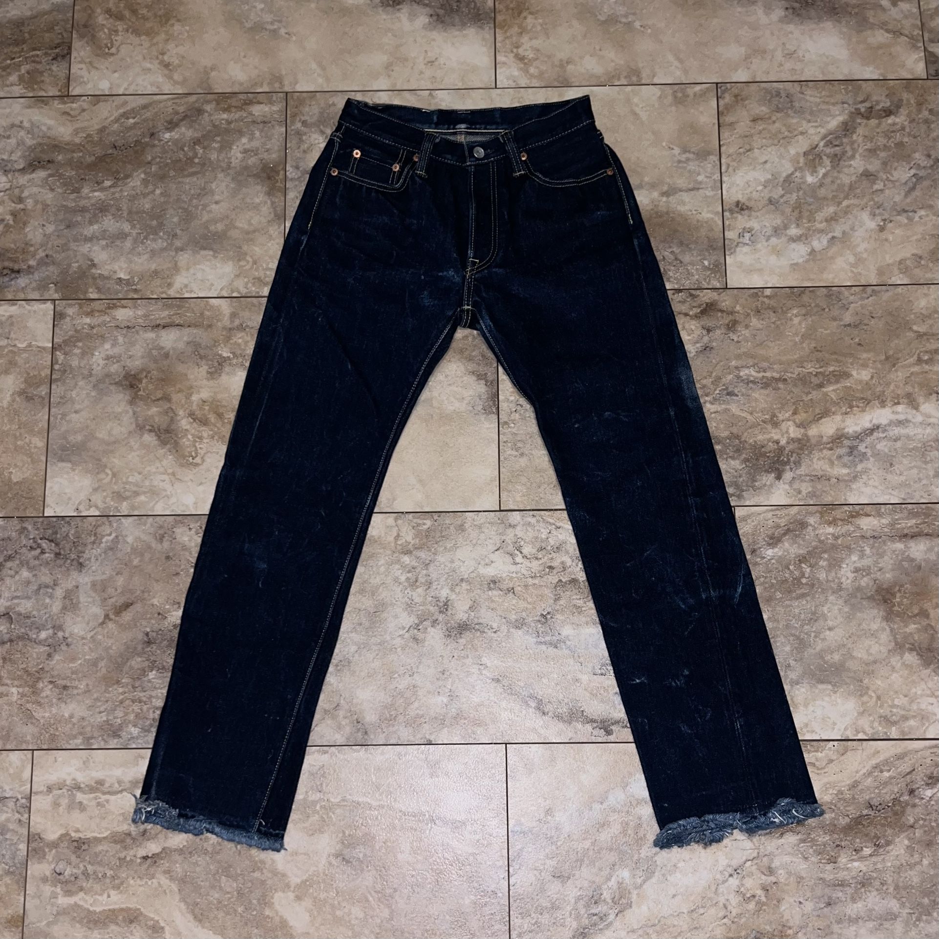 Iron Heart 634S 21oz Selvedge Denim Jeans W29 L36 Indigo Raw Faded Japan Size: 29 (Waist 27-27.5”, Inseam 29”) Pre-owned with fading and light wear throughout. Chainstitched hem with natural roping. No major flaws, overall good condition. (See photos)