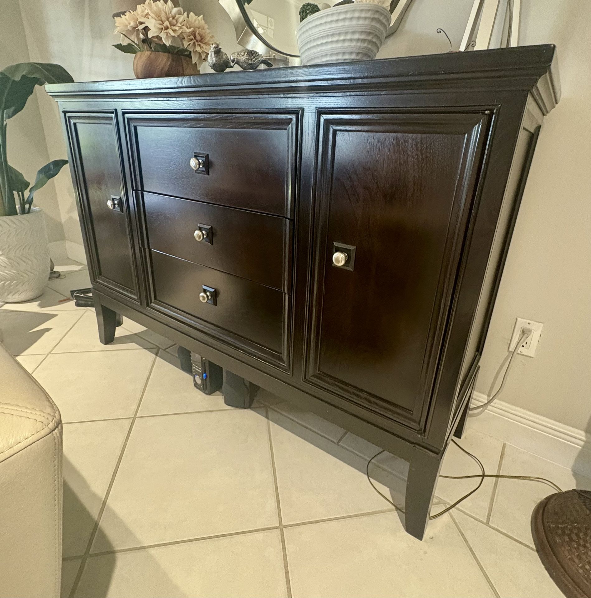 All wood buffet / sideboard can be used in living room or dining room- espresso color - great accent piece! Just beautiful - $180 60” long 19” wide 41” high CASH ONLY PICK UP IN WEST JENDALL ZIP CODE 33183