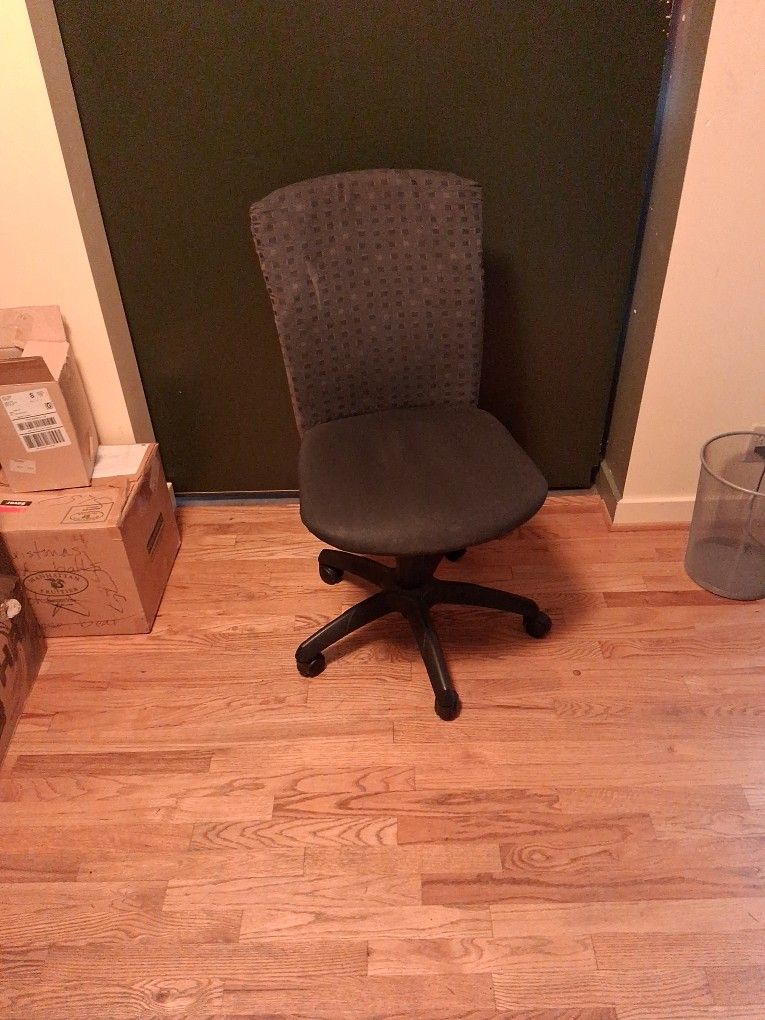 Well used but still functional. One chair is like distressed leather. The other is a synthetic fabric. No rips or tears. The wheels are brand new. Non-smoking home.