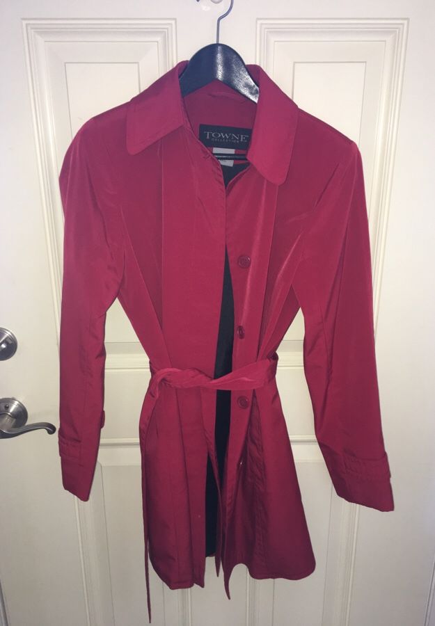 Rain resistant red spring coat. Gently used. Belt loops are removed but you can just tie the belt around. Size small. Pick up only.