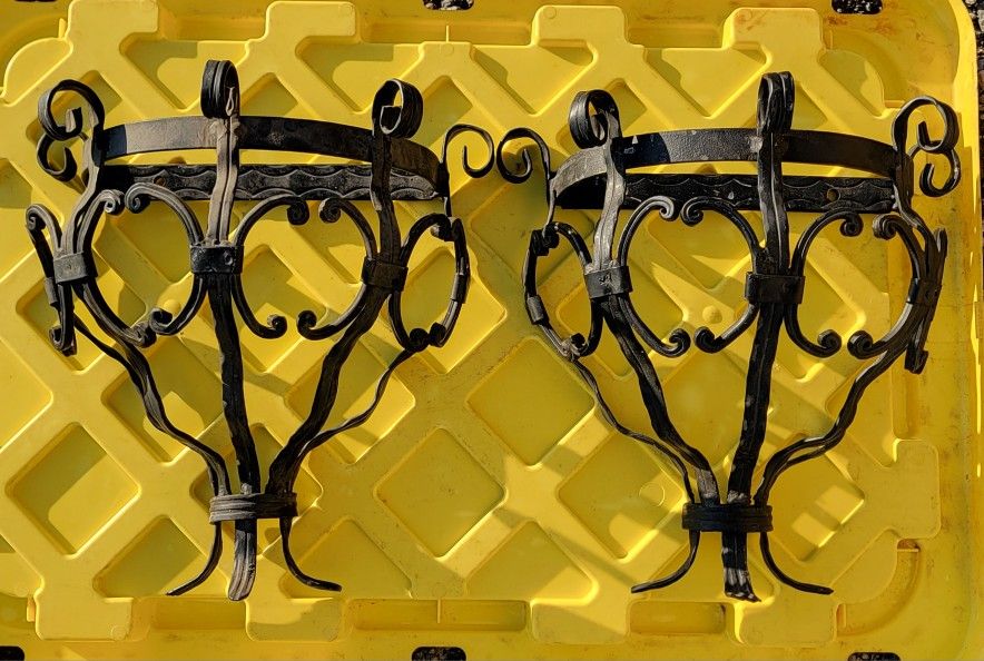 Decorative metal wall-mount baskets Not too sure what these are but I think they are decorative wall-mount baskets to hold maybe fruit, plants, etc. If you put wood on top, it could work as a shelf too. Made of heavy duty metal. Message with any questions. Asking $20 for the pair.