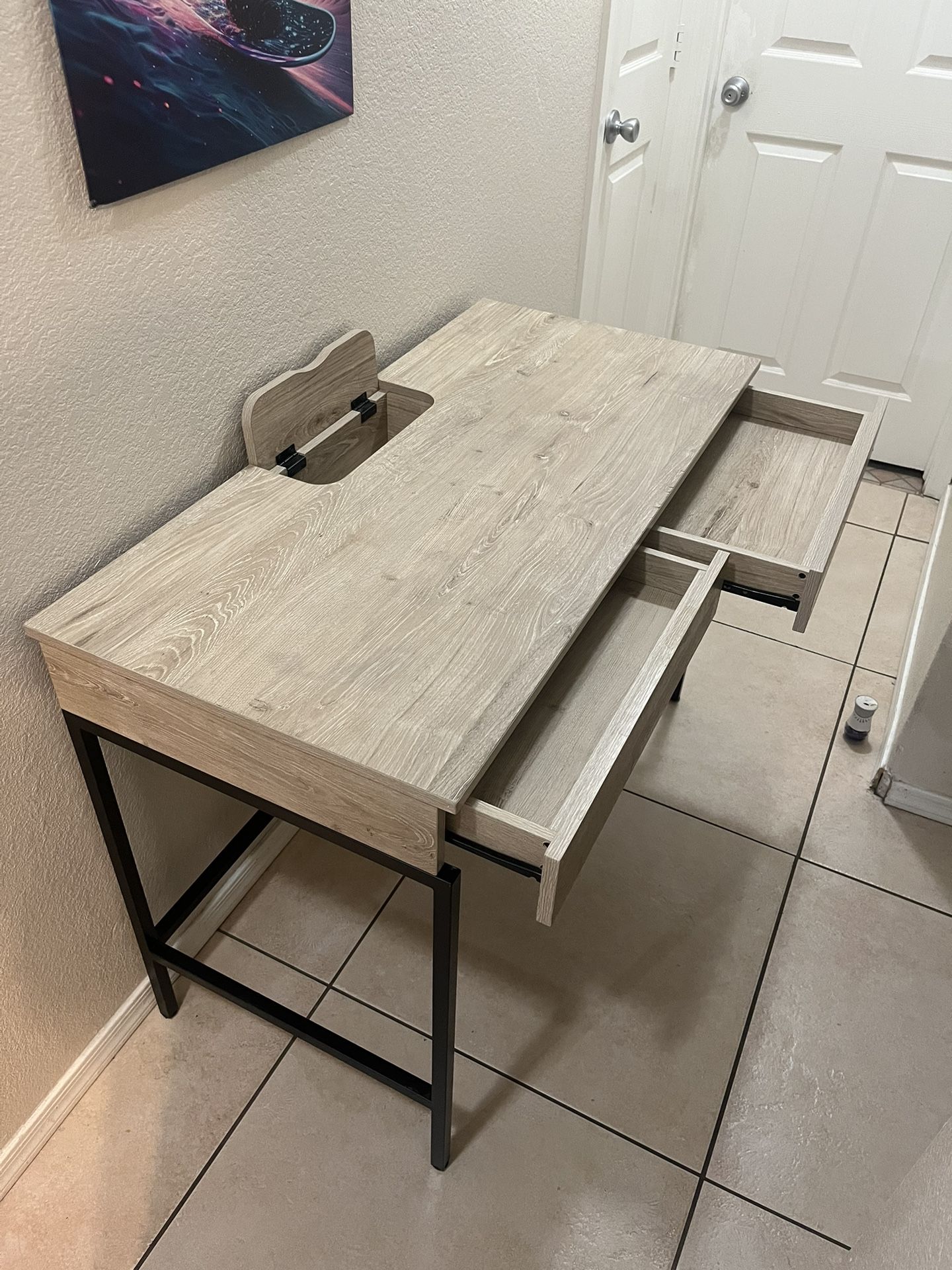 Beautiful Wood Laminate Computer Desk with (2) 110v Outlets & (2) USB Outlets on top with cable management flap. Wooden Top with 2 Drawers and Durable Metal Leg Base - Great computer desk or office desk. Measurements: 42” Length x 20” Wide x 30” Tall