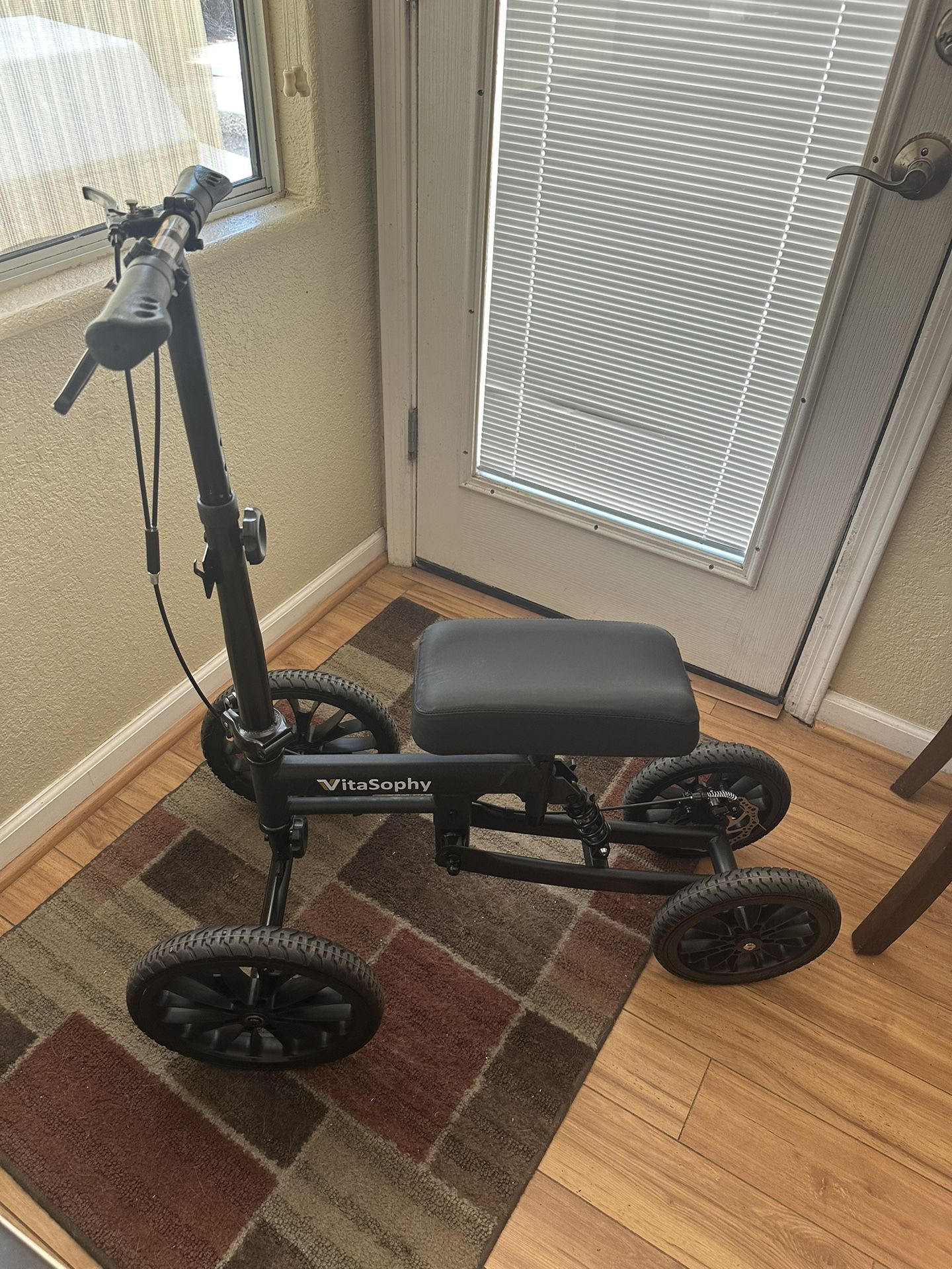 Great condition, nice big wheels rides very smooth. Handles fold down, has locking disc brakes, and adjustable spring for your knee. $75 Thank you Crutches Cane Mobility Handicap accessible