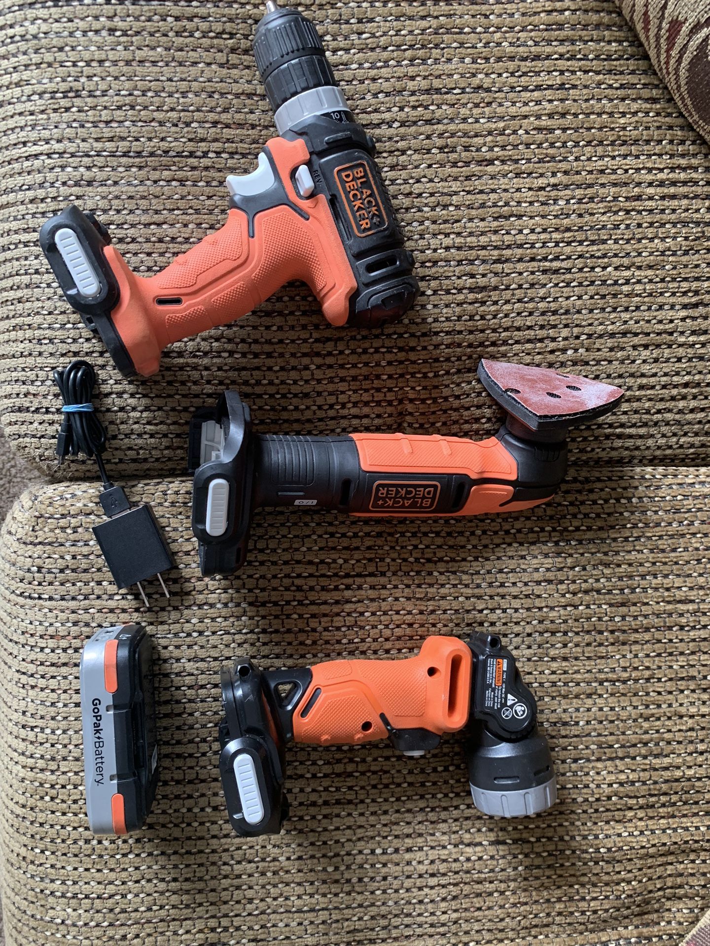 Black and Decker GoPaK 12v drill/driver, sander, flashlight cordless kit