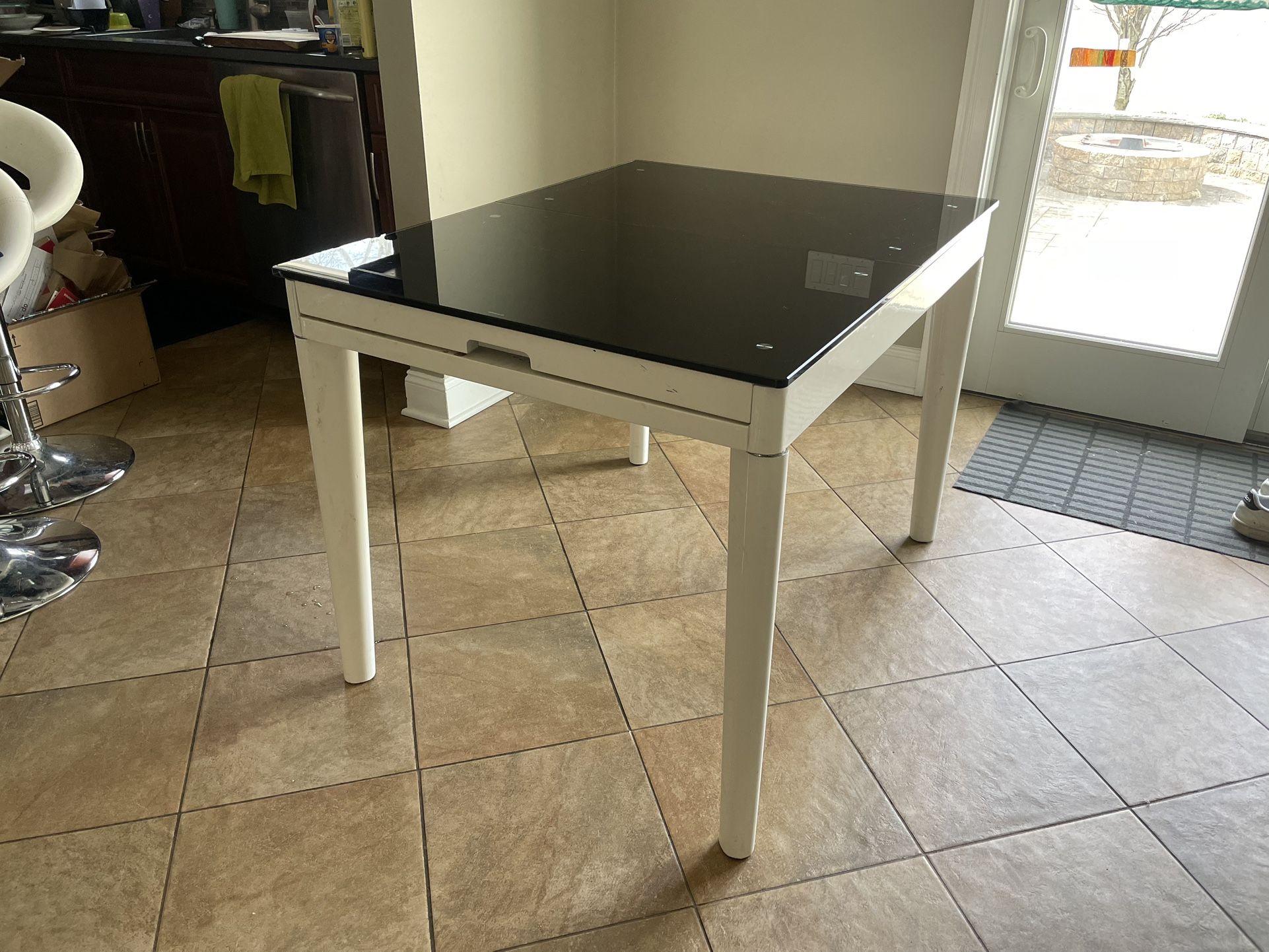 Tempered glass and wood dining table with two self contained butterfly leaf. 42(expands to 71)x32.