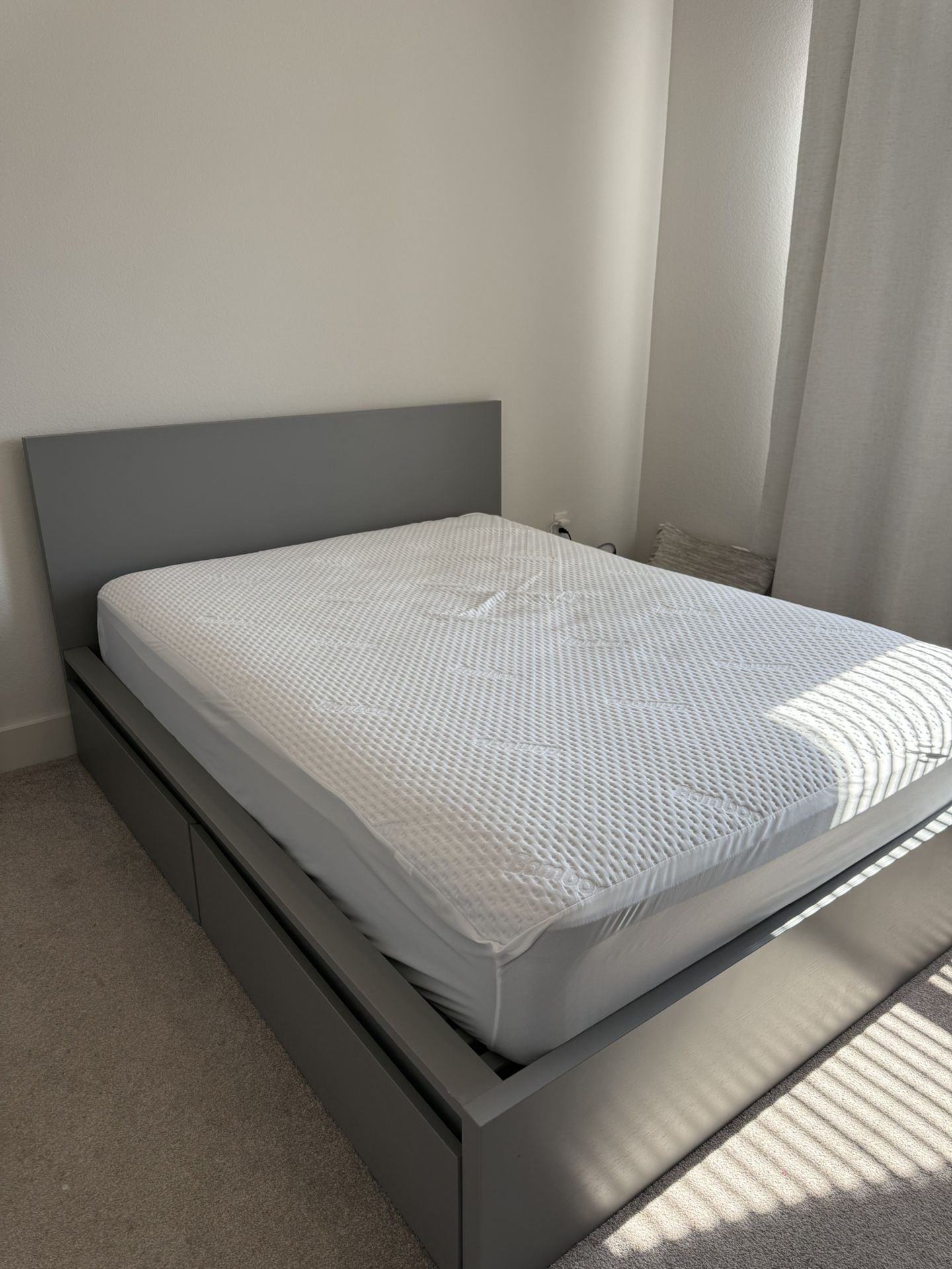 Mattress not included - Queen size bed with upgraded slates and four storage drawers - I included the screenshots for the bed and upgrades From ikea (this frame is gray) - 1 out of the 4 drawers the cover came off and can be easily put back on (see 3rd photo)