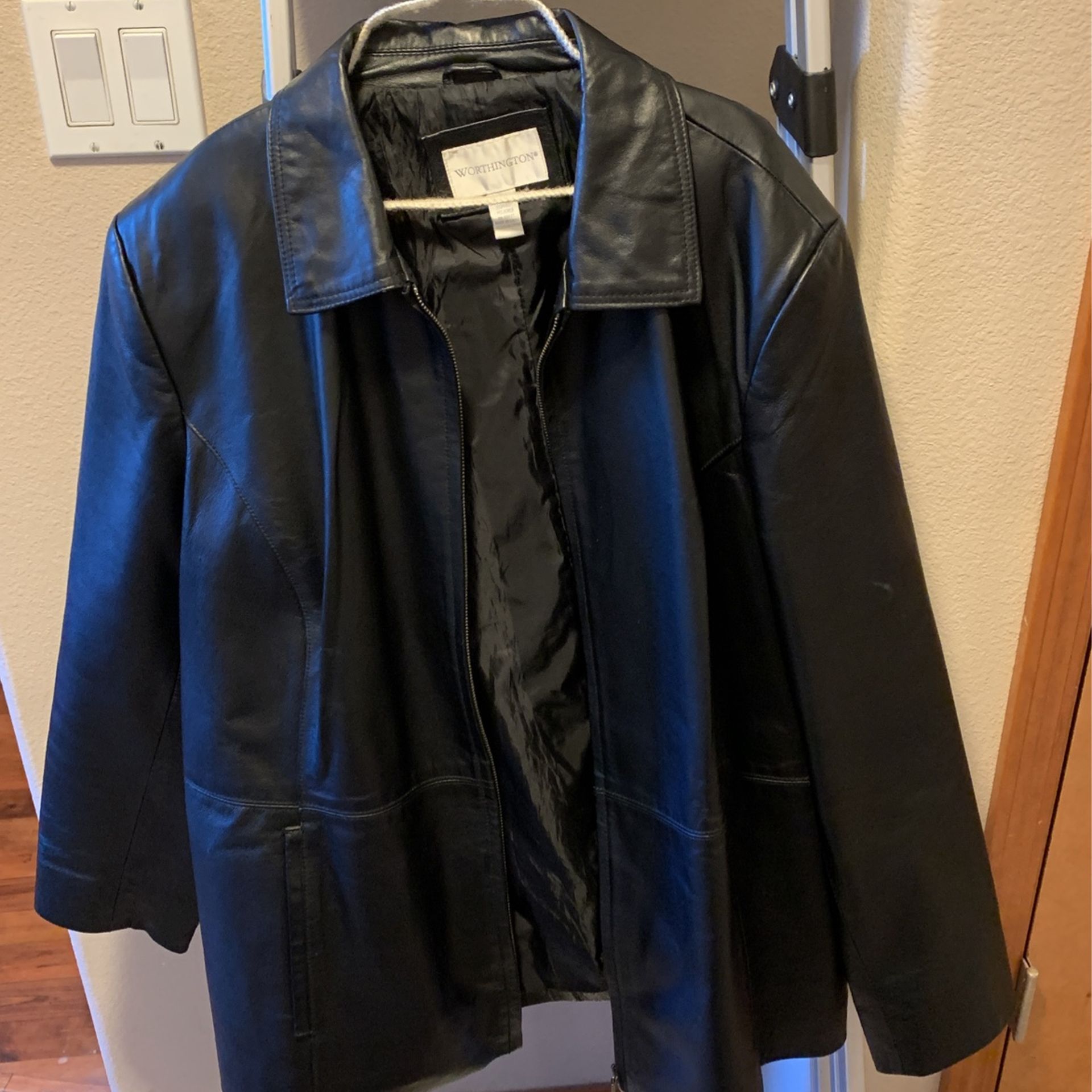 Black leather jacket. In good condition. Only worn a few times. Runs smaller in size. I am in Bethany area Fits approximate 5’7” person