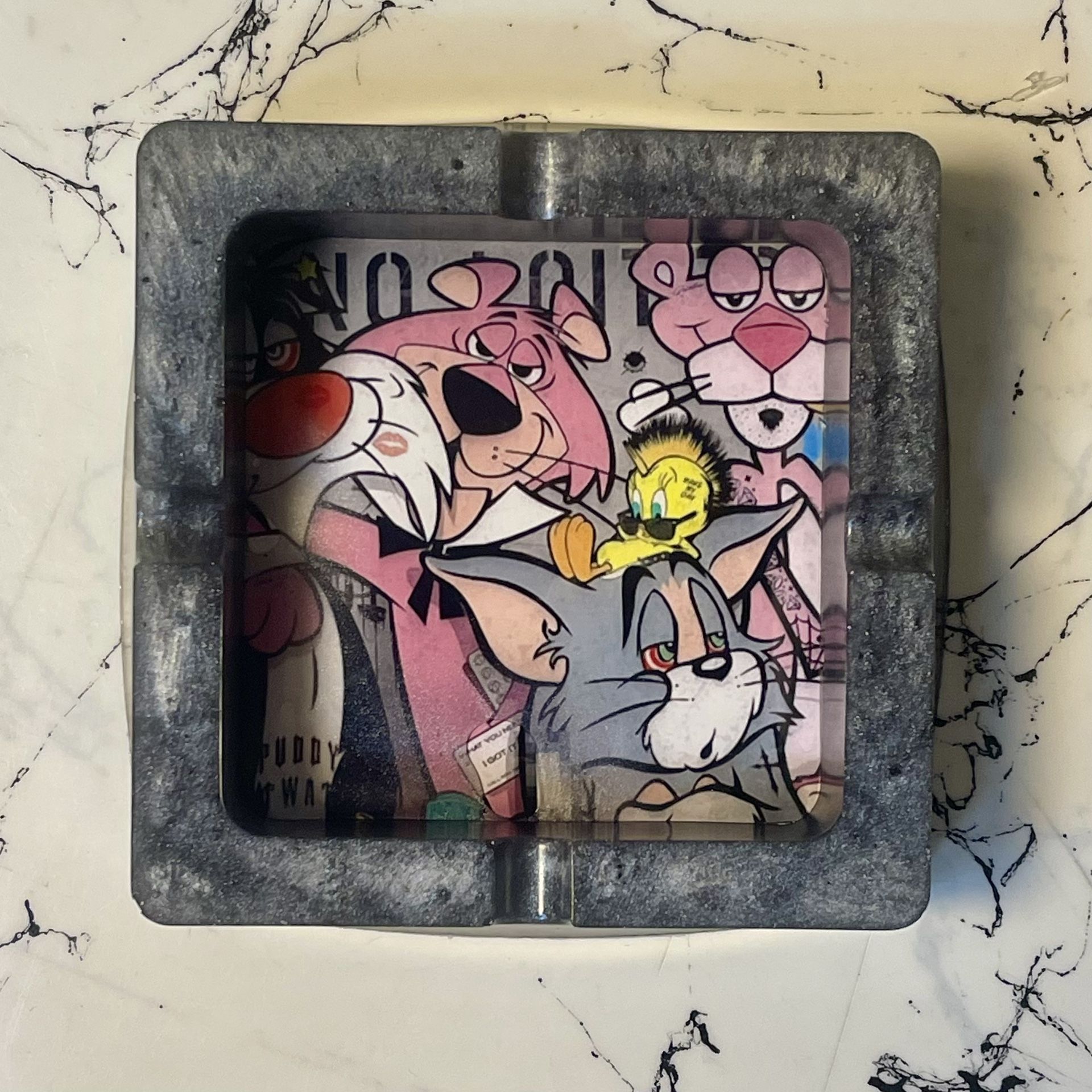 Add a playful touch to your space with this handmade cartoon cat–inspired ashtray, featuring designs inspired by a yellow bird–style character, a pink panther–style cat, and one additional cartoon cat design. Each piece is crafted from high-quality resin with a smooth, glossy finish. Size: 3.94in x 3.94in