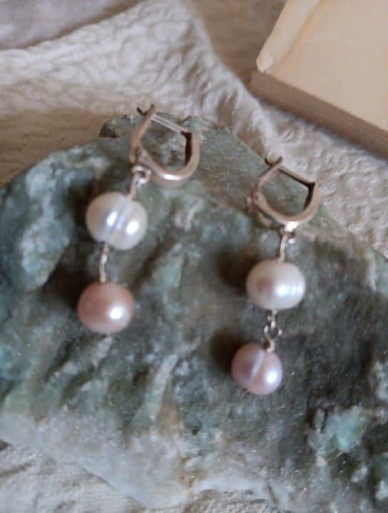 Gorgous dangle pearl earrings in sterling silver. Stamped 925. They will make a lovely gift. Excellent artistic work and quality. Pearls are big and about 2 inches long. In Tujunga. See additional jewlery.