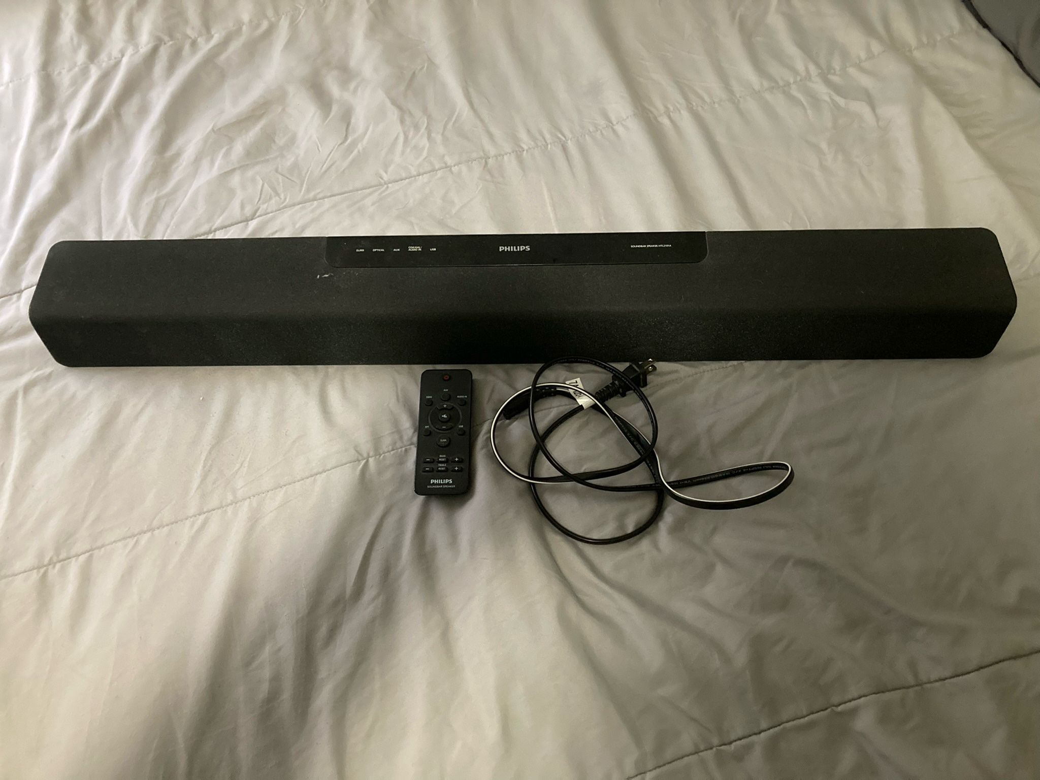 Awesome Philips soundbar speaker HTL2101A. Comes with the remote and power cable. Has optical and RCA inputs for easy connection to your TV or other devices. Great for boosting your home audio!