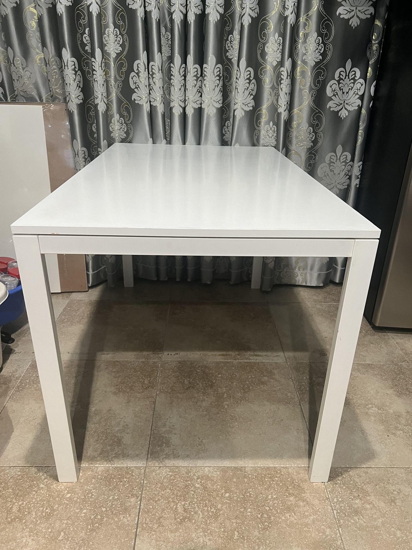 Table Top is made of Wood and the legs are made of Metal. It is very sturdy. Very good condition Table: Length: 46.5 inches Wide: 29.5 inches Height: 29 inches
