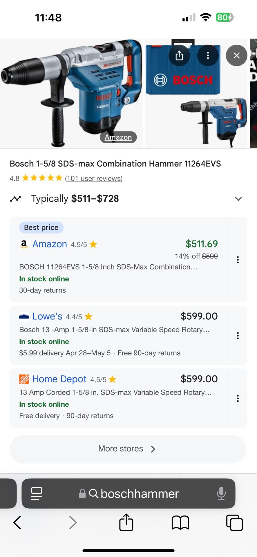 Manufacturer The Bosch 11264EVS 1-5/8-In. SDS-max Combination Hammer features a powerful 13.0-AMP motor and has a dual-mode selector for combination versatility - rotary hammer or hammer-only mode. Providing 6.5 ft.-lbs. of impact energy, the tool weighs only 15.2 lbs., for a top performance-to-weight ratio. The hammer has integral clutch that helps to minimize torque reaction. Concrete contractors will appreciate the production in drilling and chiseling applications. The hammer's 12-position Vario-Lock helps to optimize chiseling angles. Bosch's Vibration Control in the hammer mechanism and grip area provide improved user comfort. And with Constant Response circuitry, users benefit from smooth starts and constant load under pressure.