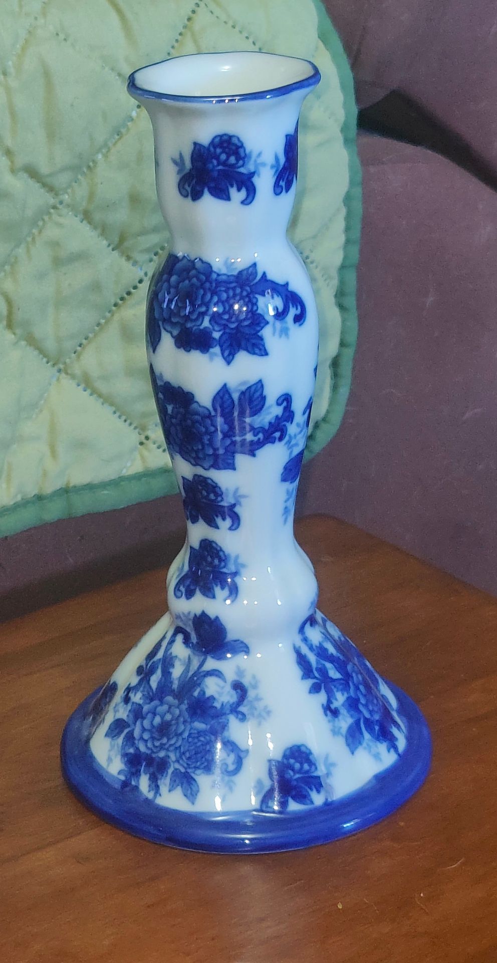 Blue and white porcelain cracker barrel candle holders.