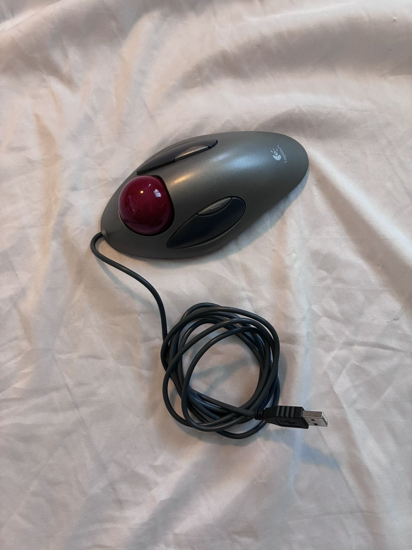 Discontinued Logitech Trackman Marble Mouse Model Number: T-BC21 Color: Silver, Dark Grey, and Red Condition: Like new condition, minimal wear