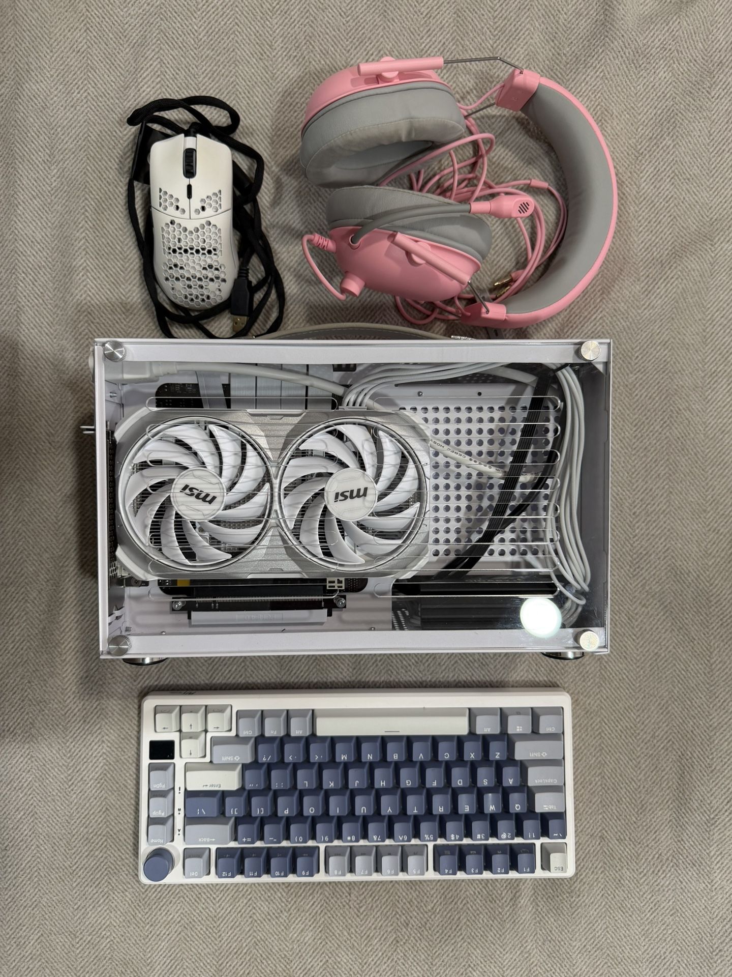 Full custom Small Form Factor build CPU: AMD Ryzen 7 5800x CPU Cooler: Thermalright AXP120 Motherboard: Gigabyte A520 AC Mini ITX RAM: Corsair Vengeance RGB 32gb DDR4-3600 Storage: Silicon Power P34A60 2 TB M.2-2280 3.0 x4 GPU: MSI Ventus 2x OC RTX 4060