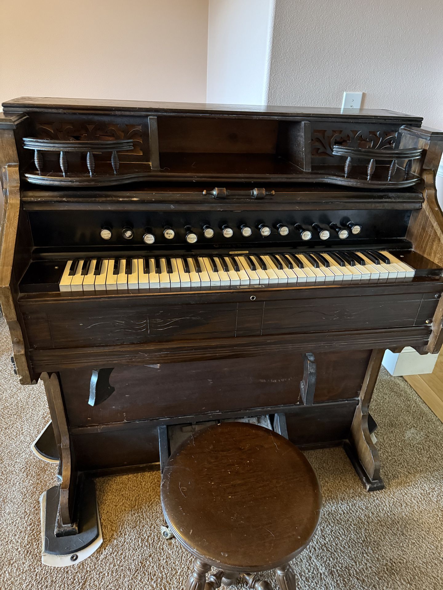 High quality Crane & Sons organ made in Canada in 1880s. Originally sold in UK. My mom bought it at the Renton Auction in 1976. Still works and is great for Halloween and Christmas. Heavy- will need at least 2-3 people. Including chair.