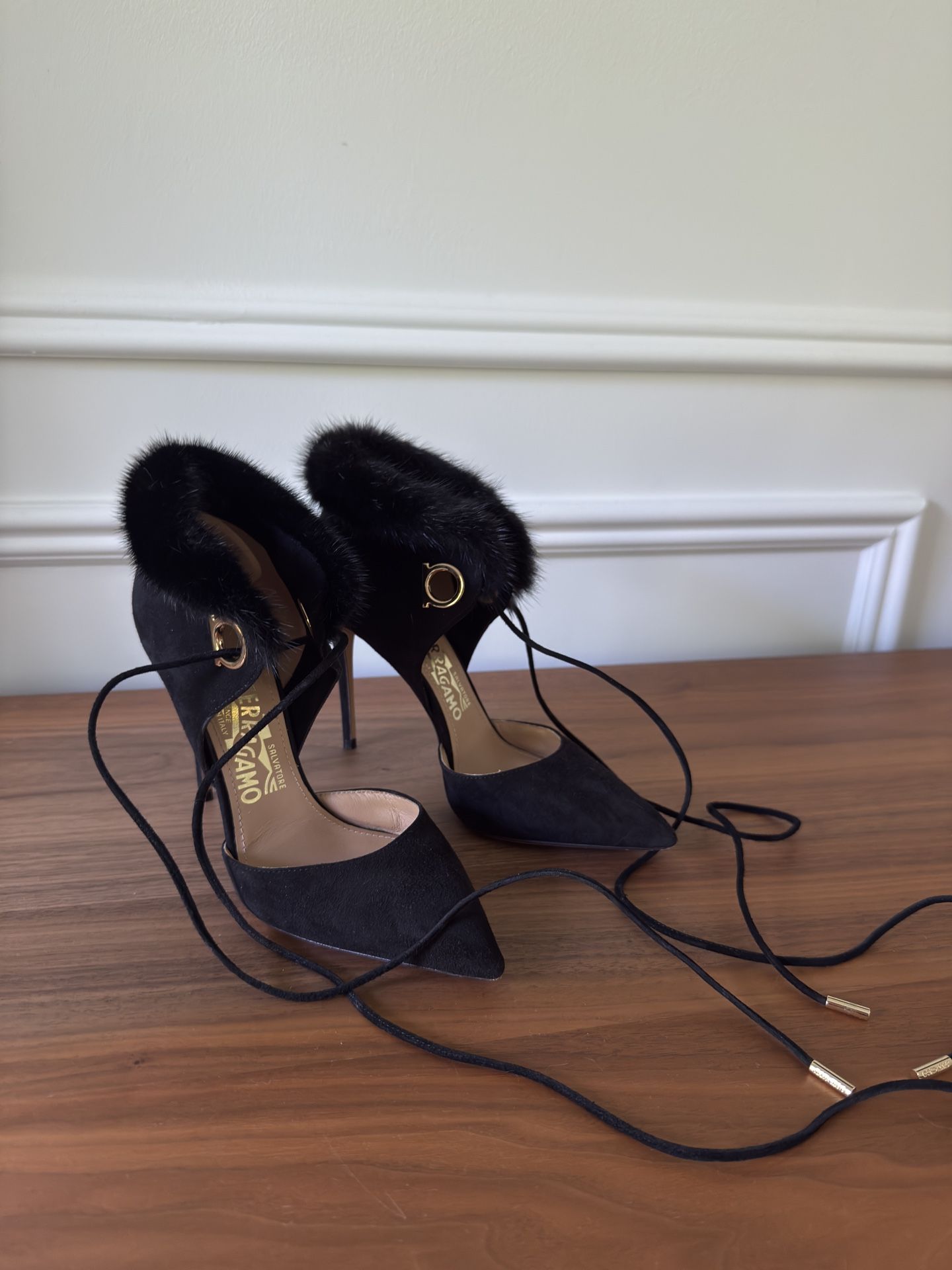 Salvatore Ferragamo real fur trim heels Strappy tie black suede Size: 5.5