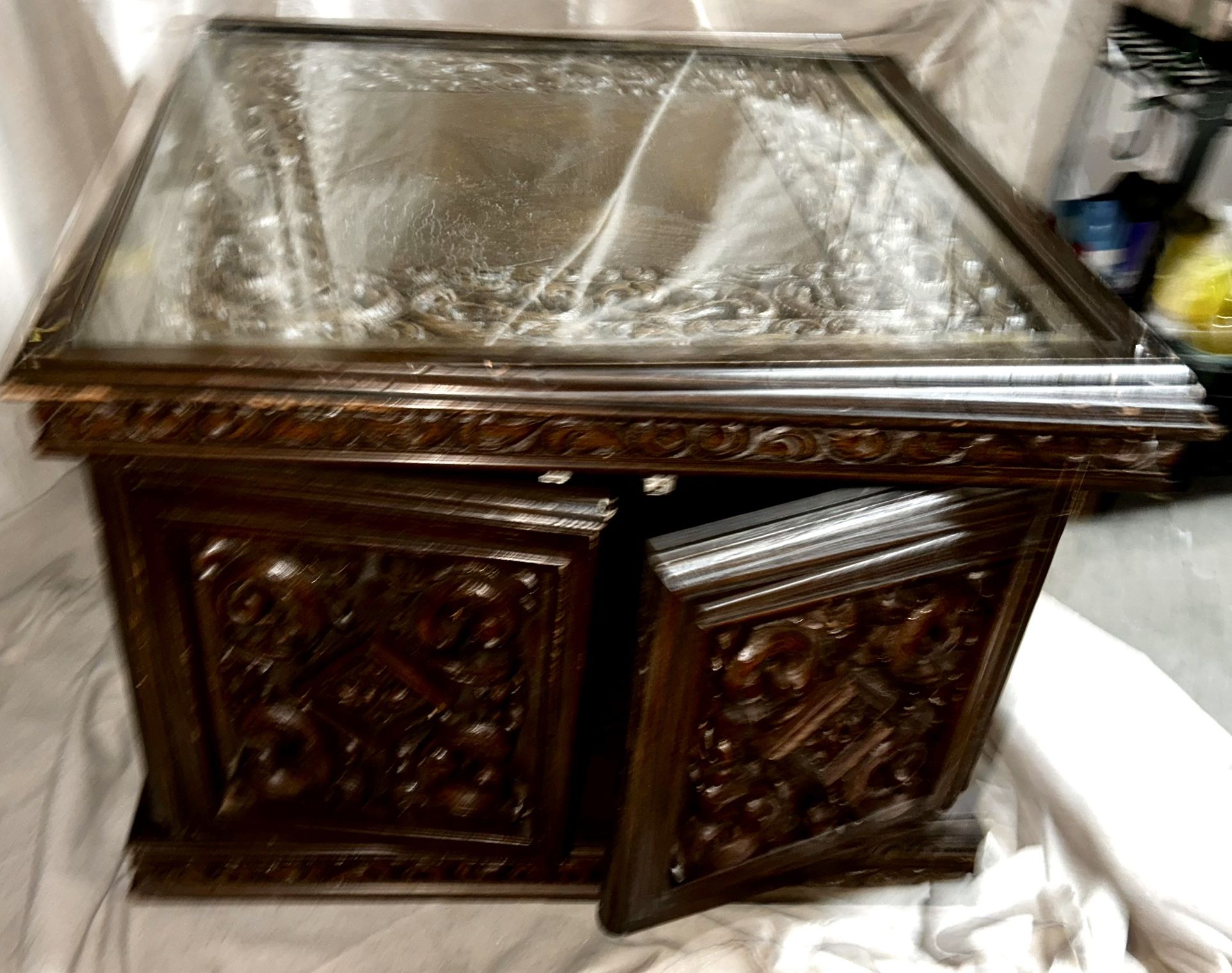 Make your offer I need to sell this big heavy coffee table !!!! This coffee table is a very rich chocolate color and is extremely heavy! A few bangs and scrapes here-and-there but the glass is not scratched This is a beautiful table 28”Lx28”Wx20”H