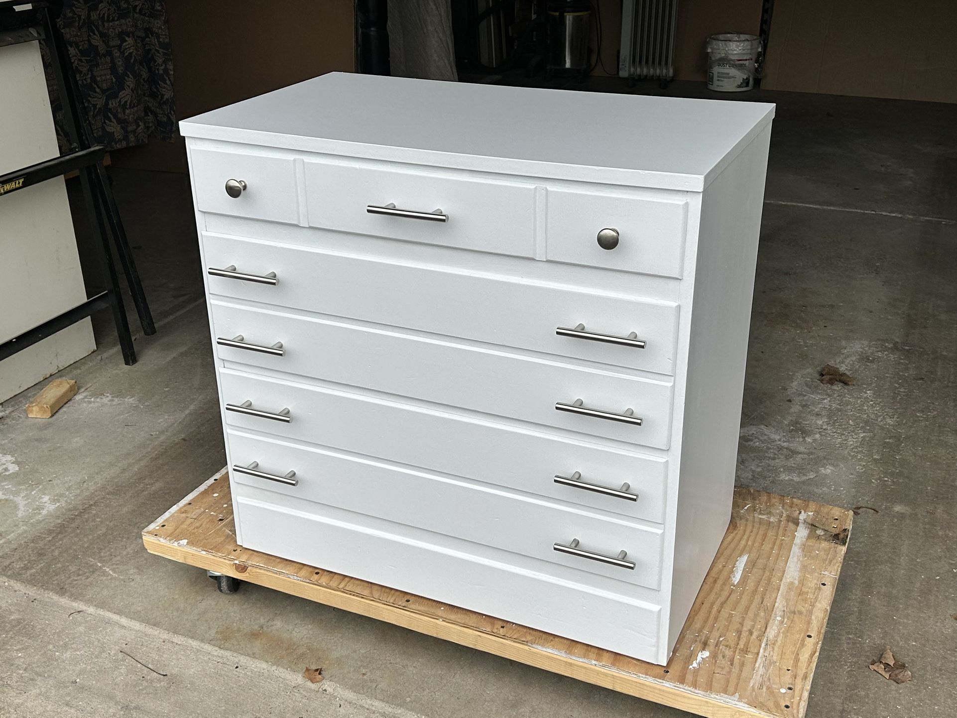White dresser. 3 drawers. Wood construction. Drawers smooth and dovetailed front and back. Brushed nickel hardware. 32x19 31” Tall