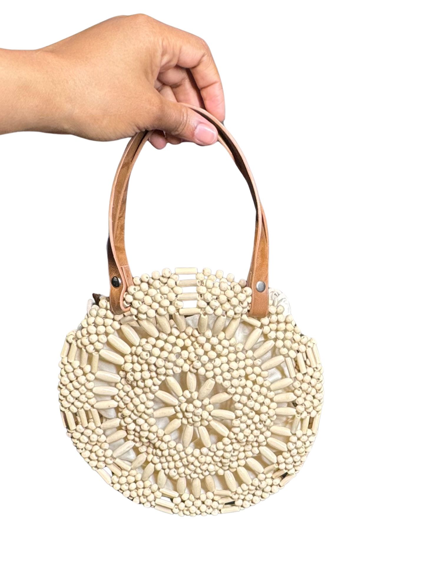 Beige Wood Beaded, Brown Leather Strap, Round Purse.