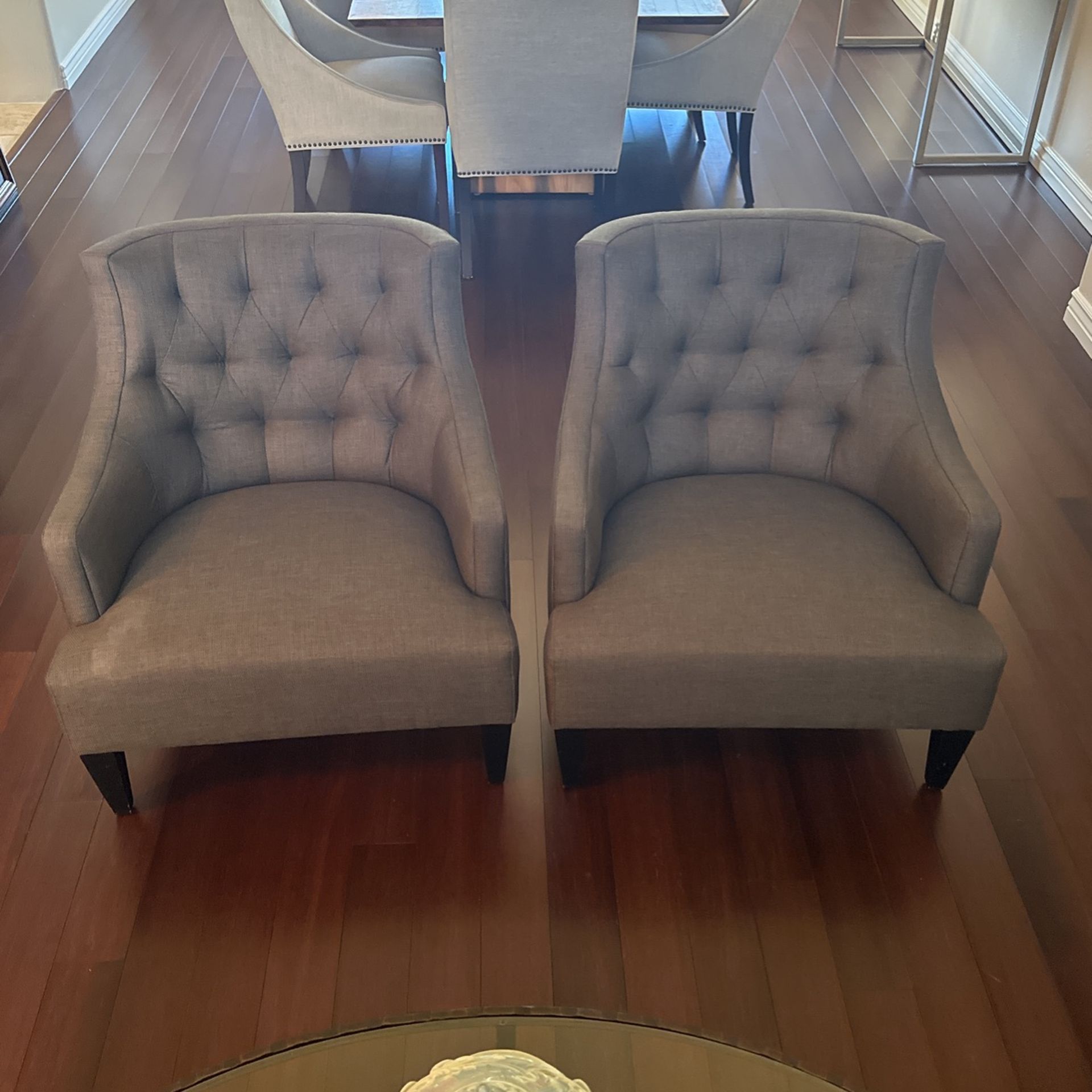 Amazing condition grey, upholstered accent chairs Back of chair height: 35in Seat height: 18in Width: 33.5in Seat depth: 22in