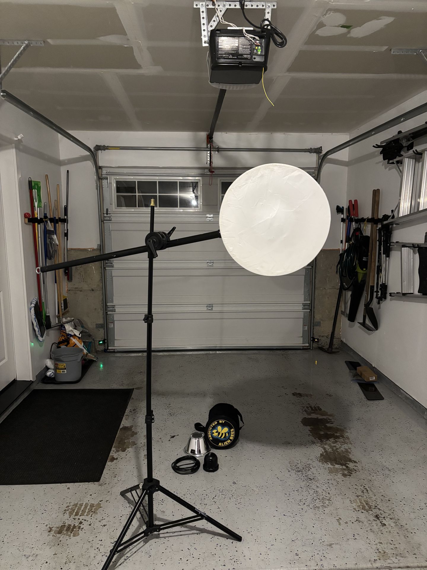 I am selling my Alien Bees gear. This is a fully operational complete rig. It comes with a 7' tall BOOM STAND and I am including a compatible Beauty Dish, and an umbrella. Comes with strobe carrying bag